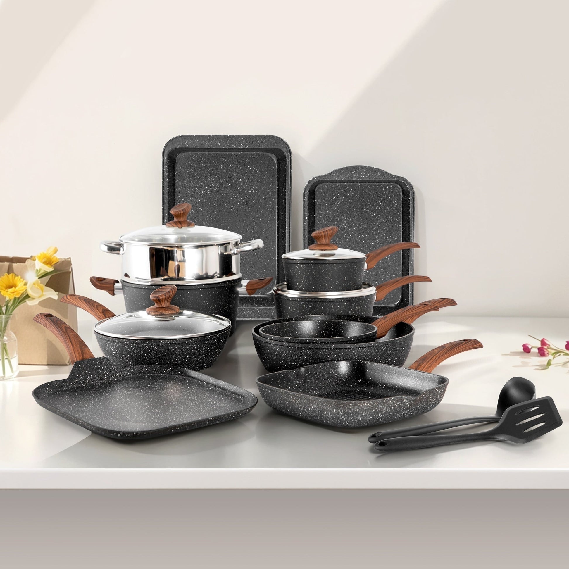 Batterie de cuisine en granit 17 pièces, ensemble de casseroles et poêles antiadhésives