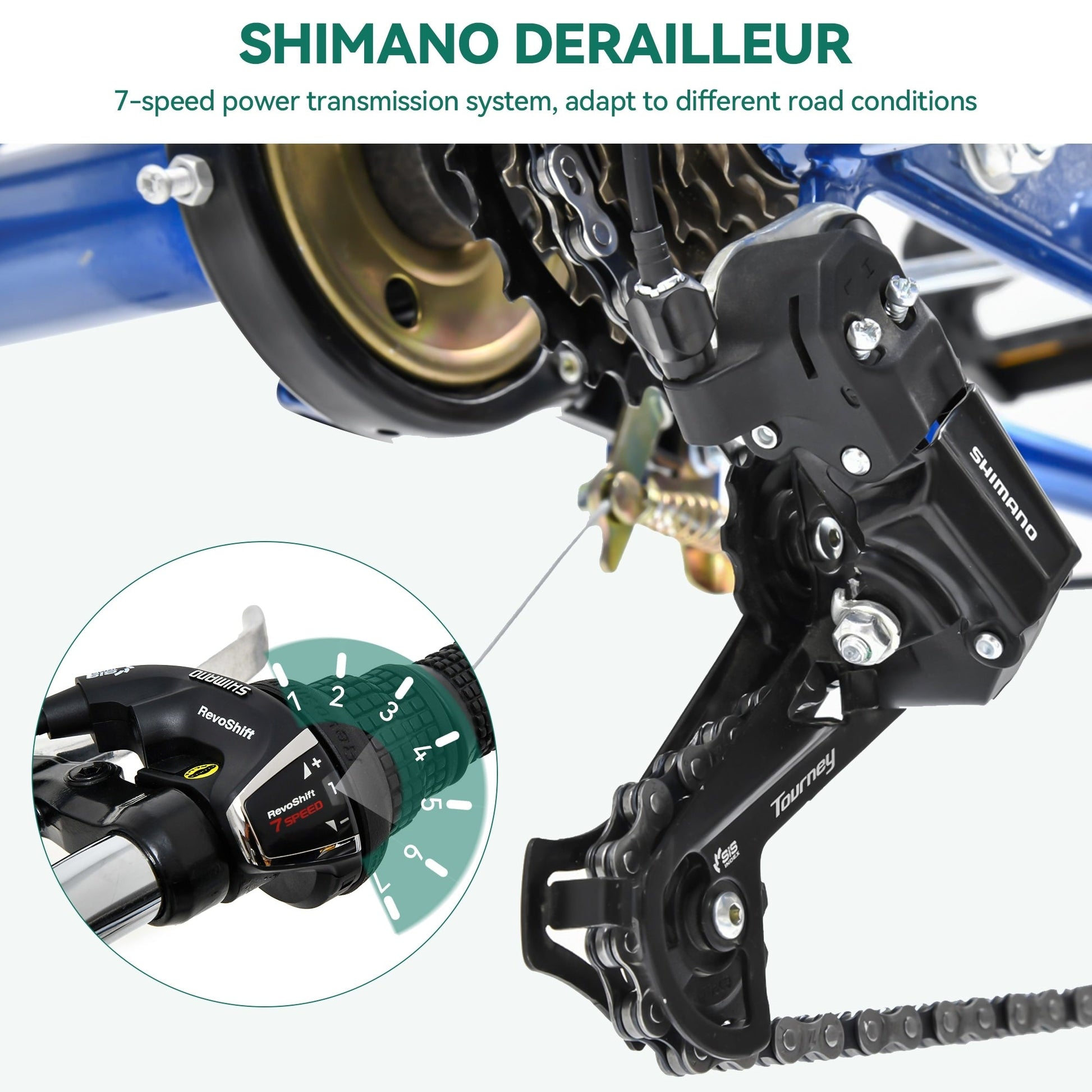 - Equipé d'un changement de vitesse Shimano, il y a 7 vitesses selon les différentes conditions de route
