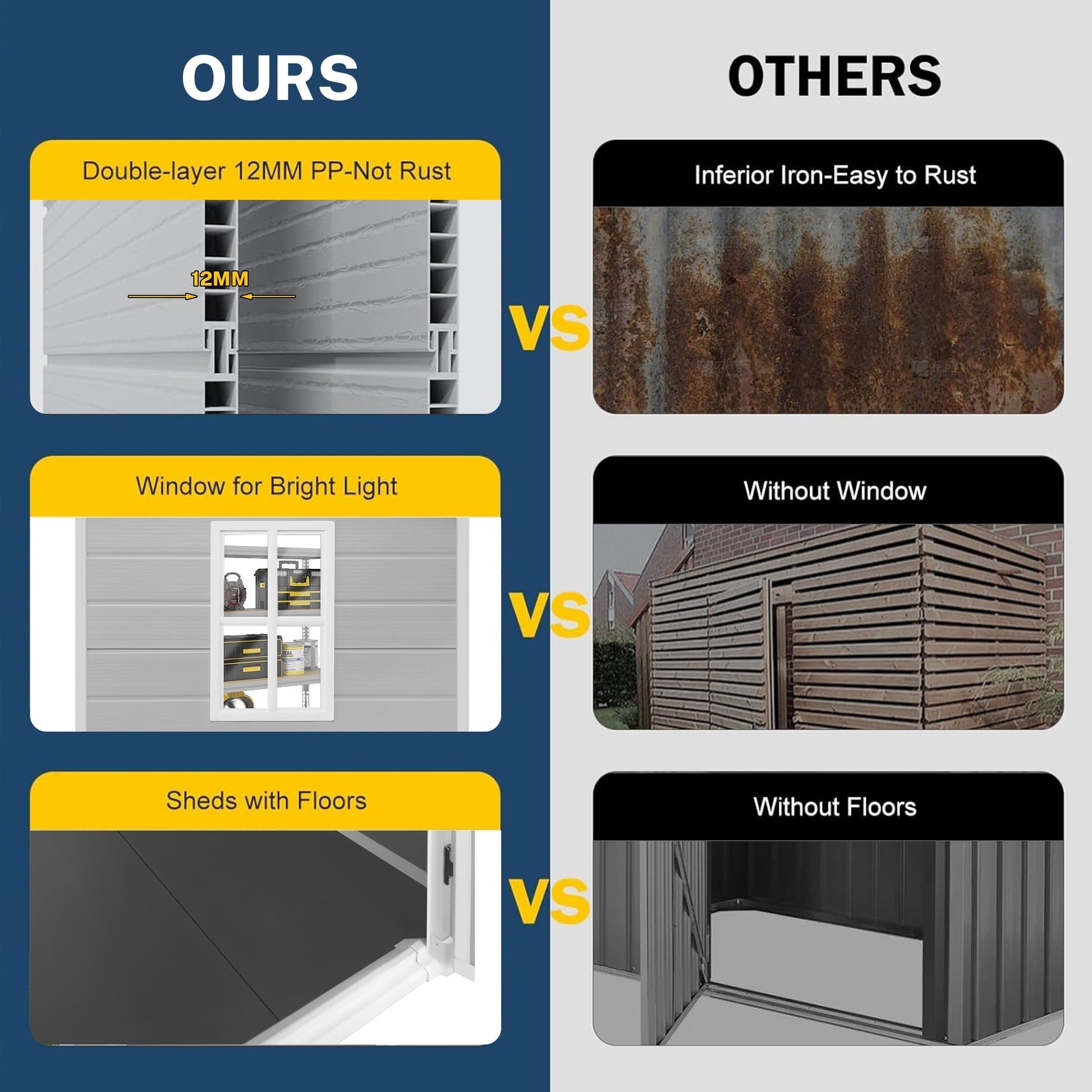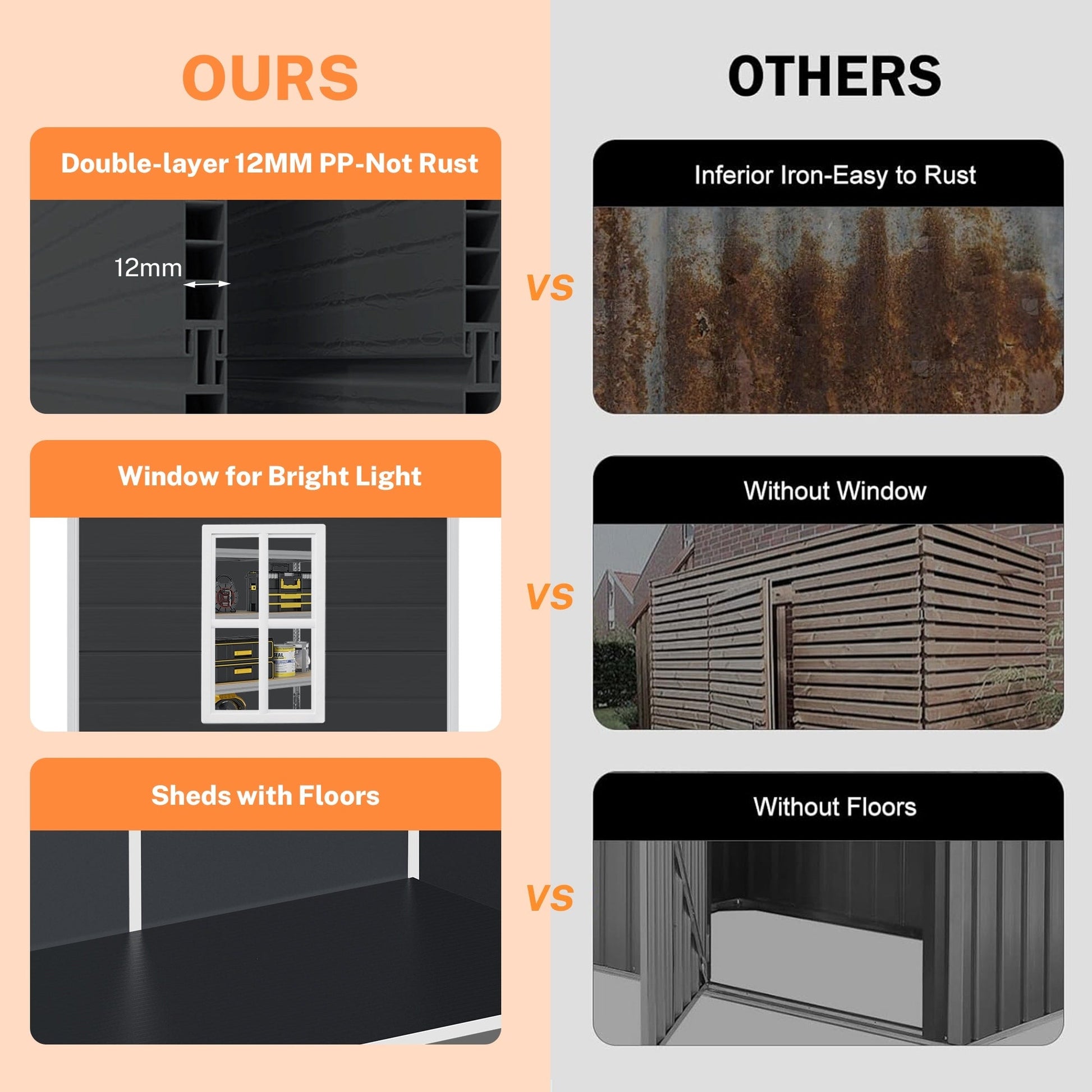 Abri de rangement extérieur en plastique et résine toutes saisons de 6 pi x 4 pi/6 pi x 8 pi/8 pi x 6 pi/8 pi x 10 pi avec plancher, abri à outils Spire