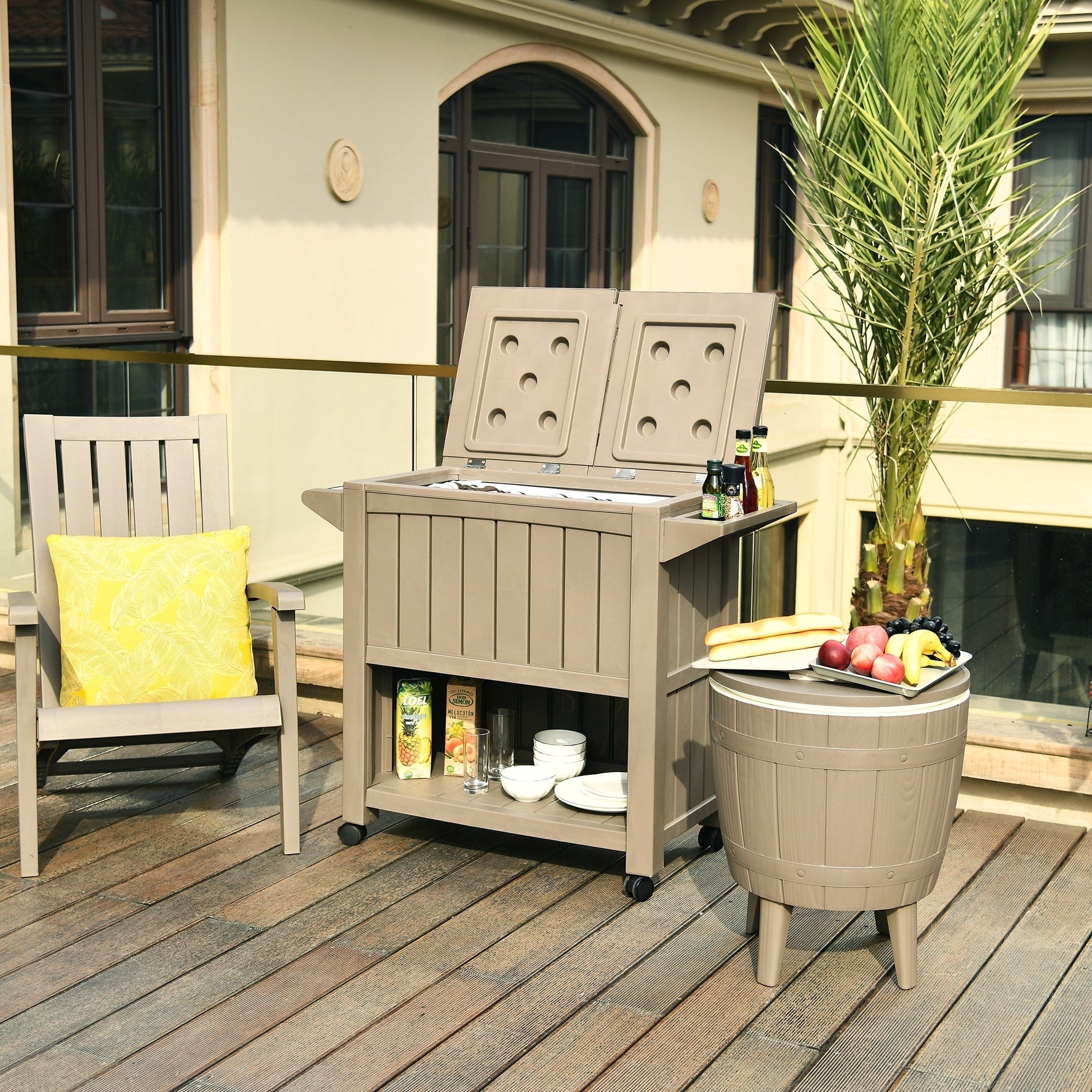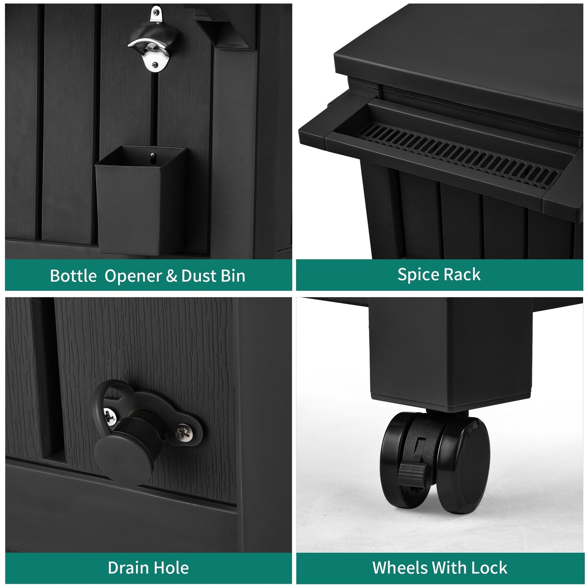 GRANDE CAPACITÉ - Ce chariot de glacière de patio est livré avec un seau à glace de 85 pintes/21 gallons et un espace de rangement ouvert pour refroidir vos boissons pendant des heures.ACCESSOIRES MULTIFONCTIONNELS - Comprend des conceptions distinctes polyvalentes, notamment un décapsuleur, une poubelle assortie, un support à épices et un espace de rangement inférieur pour plus de commodité, ainsi que le sac à glace en PVC avec des trous de drainage pour remplacer facilement l'eau ou les glaçons.ROULETTES VERROUILLABLES - La glacière à roulettes bénéficie de 4 rouleaux multidirectionnels, dont 2 sont verrouillables pour maintenir la glacière en place pour une stabilité supplémentaire sur des surfaces inégales.ASSEMBLAGE RAPIDE - Ce chariot à boissons d'extérieur est fabriqué à partir de résine recyclable et durable pour un entretien facile ; suivez simplement les instructions incluses pour une installation facile.MATÉRIAUX DE QUALITÉ SUPÉRIEURE - Nos chariots de glacière à roulettes sont construits à l'aide de résine résistante à tous les temps avec une texture de bois naturel pour une grande durabilité, une protection contre le pelage et les bosses, un look élégant et un toucher minimal.