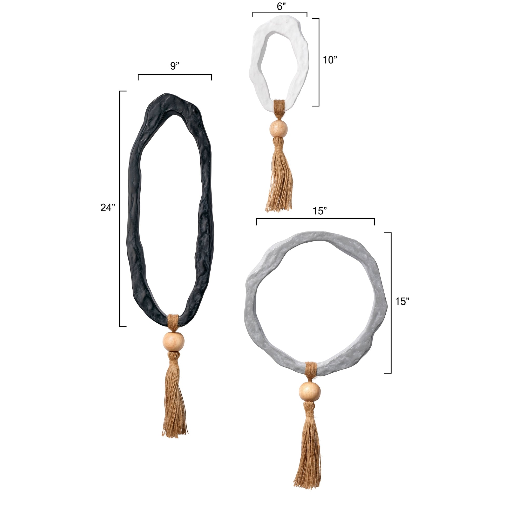 Inspiré des designs orientaux, cet ensemble de trois suspensions décoratives créera un point focal saisissant sur votre mur. Fabriqués à la main en résine, ces anneaux organiques aux formes libres sont ornés de perles de bois et de corde en sisal. Accrochez-les en rangée décorative ou individuellement, comme ornements décoratifs dans n'importe quelle pièce.