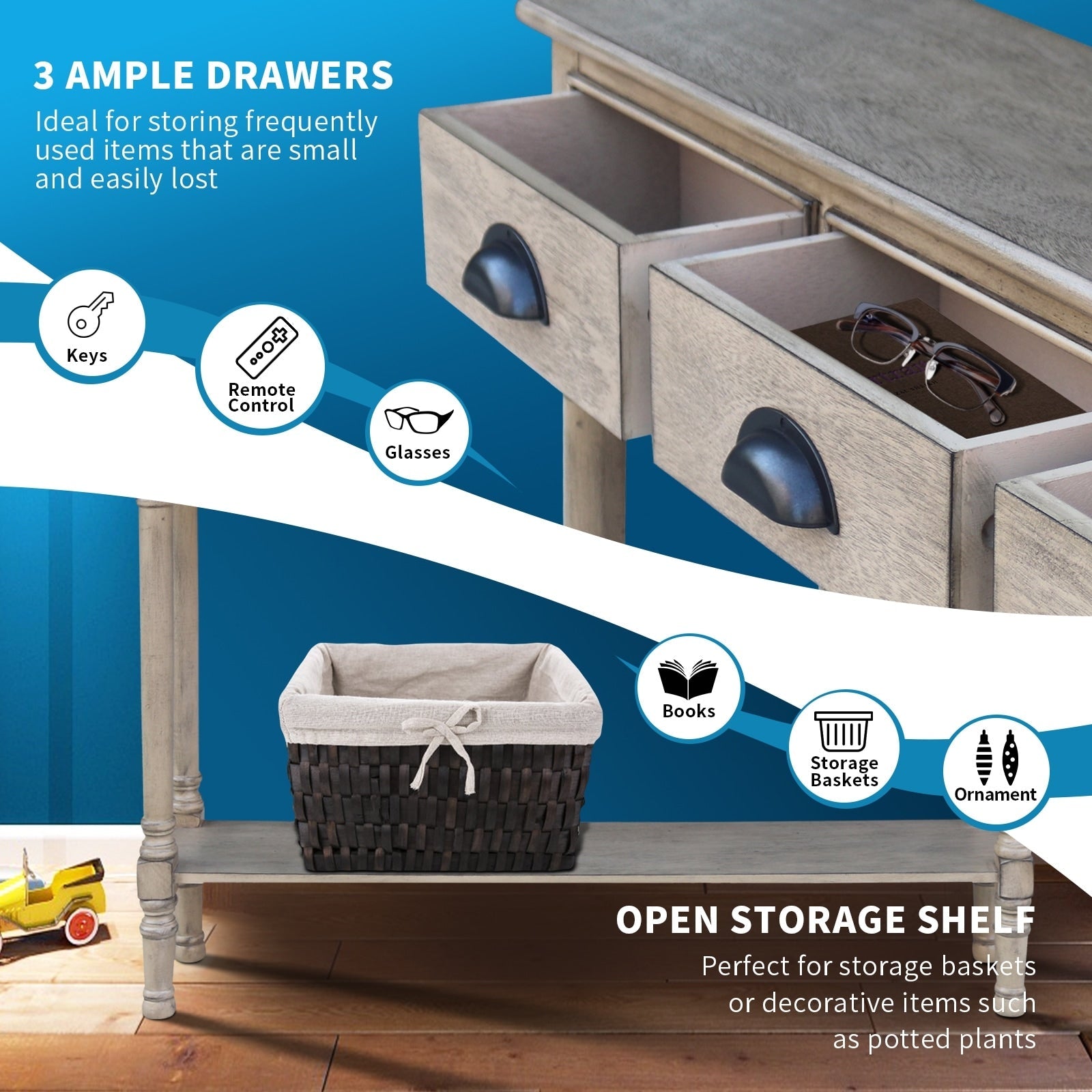 Accueillez vos invités avec style grâce à la console 3 tiroirs en bois Burlington. Dotée d'une structure en bois aux pieds finement sculptés, elle comprend trois tiroirs et une étagère inférieure ouverte offrant un vaste espace de rangement et d'exposition. Choisissez parmi six finitions polyvalentes pour s'harmoniser parfaitement avec votre décoration.
