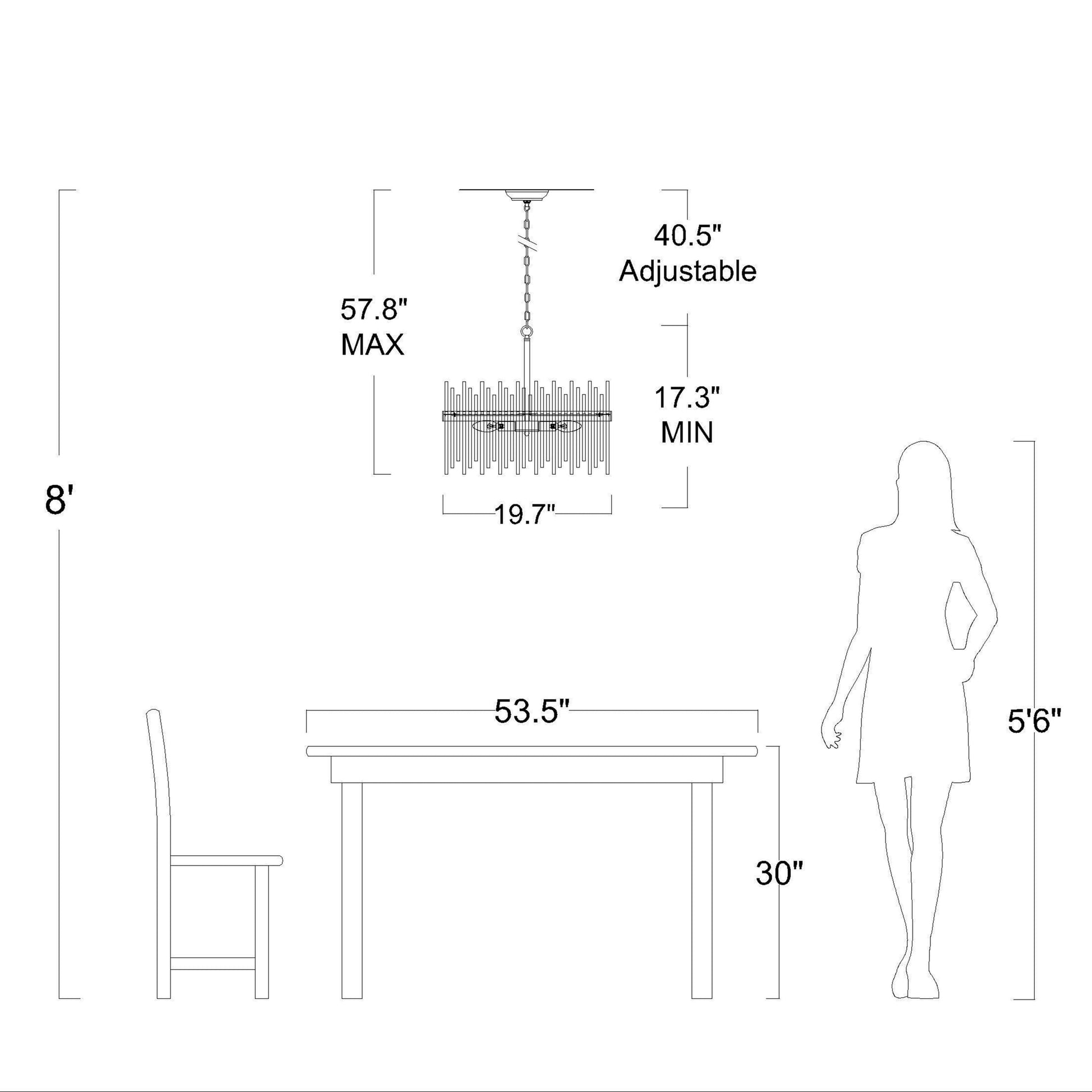 - Hauteur de suspension maximale (du plafond au bas du luminaire) : 57,8 pouces, qui peut être raccourcie.