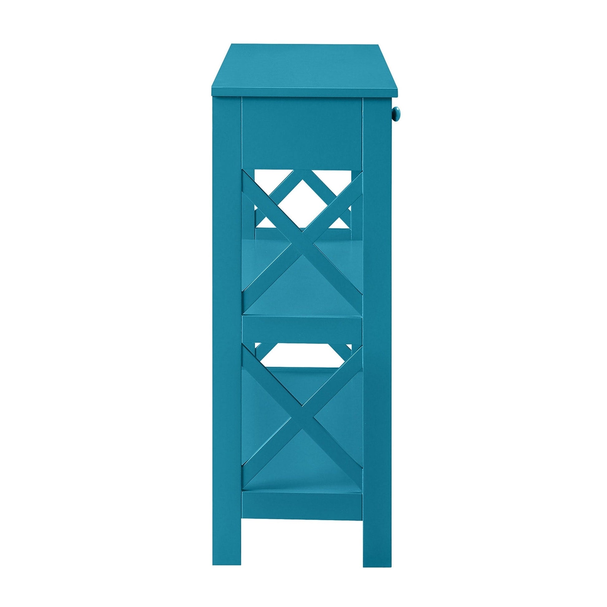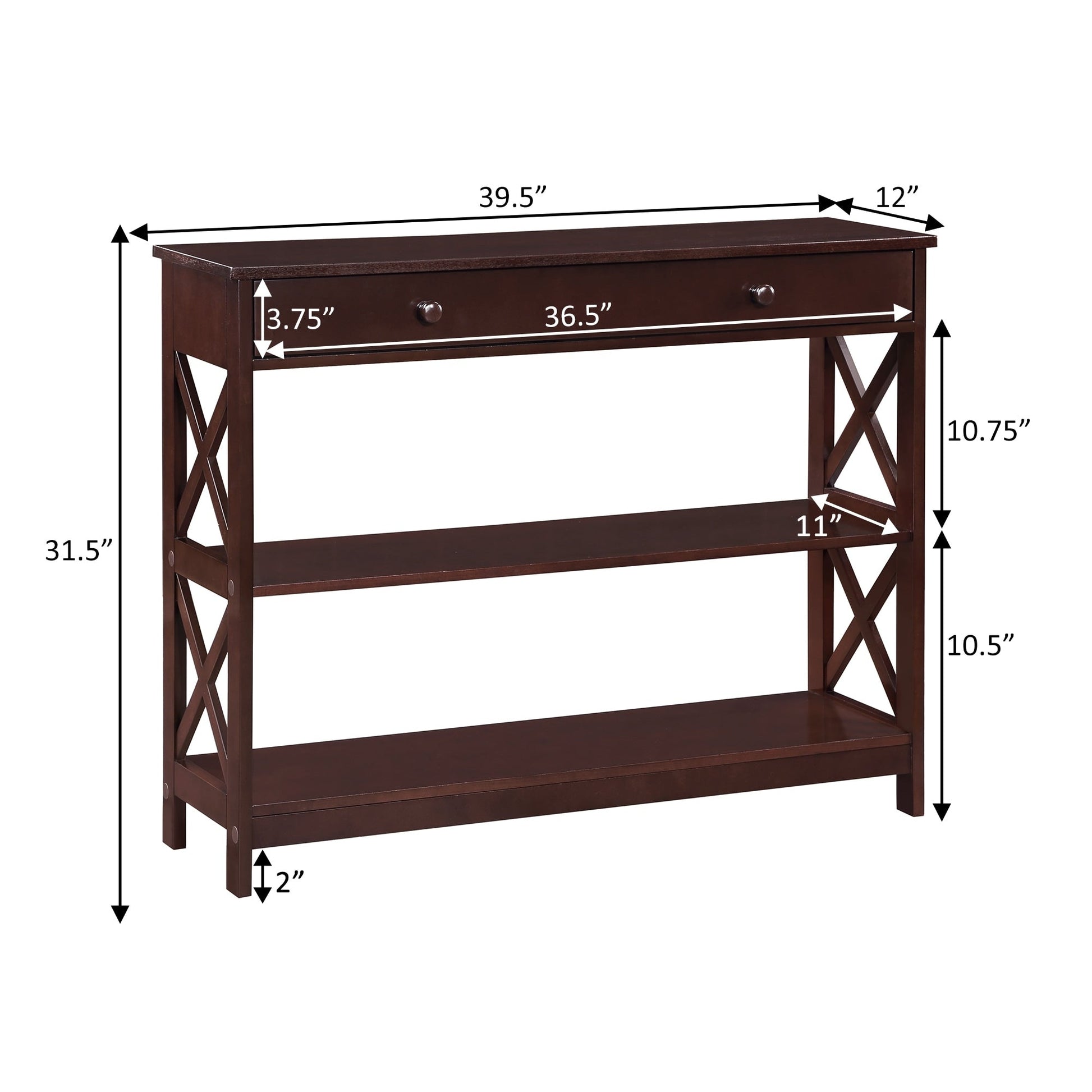 Donnez à votre intérieur un style intemporel avec la console Oxford à 1 tiroir et étagères de Convenience Concepts. Ce meuble transitionnel est doté d'un tiroir coulissant sur glissières à roulement lisses et de deux poignées élégantes pour un accès facile. Ce tiroir spacieux offre un espace de rangement généreux pour vos essentiels d'entrée et vos objets du quotidien. Ses panneaux latéraux en X et ses trois niveaux d'étagères font de cette console un objet décoratif idéal à exposer dans n'importe quelle pièce de votre maison. Magnifiquement conçu en MDF, peinture sans plomb et panneaux de particules, ce meuble est conçu pour durer. Complétez votre intérieur avec les pièces coordonnées de la collection Oxford de Convenience Concepts, vendues séparément.