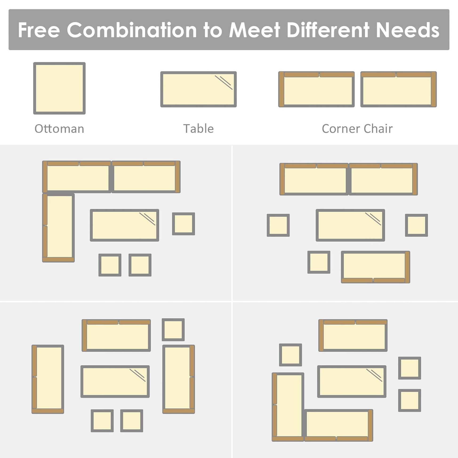 Notre ensemble de canapés en rotin 7 pièces comprend 3 fauteuils d'angle, 1 table et 3 poufs, créant ainsi un espace extérieur spacieux et confortable pour vous et votre famille. Chaque élément peut être utilisé individuellement ou combiné selon vos besoins. Grâce à sa structure en acier robuste et à son osier PE résistant aux intempéries, cet ensemble de meubles de jardin est suffisamment robuste et stable pour une longue durée de vie. Ses épais coussins rembourrés en éponge offrent un confort optimal. Dotés de fermetures éclair, leurs housses sont faciles à retirer et à nettoyer. La table à manger assortie, avec son grand plateau en bois synthétique, est idéale pour accueillir boissons et repas pendant que vous vous prélassez au soleil. De plus, ce mobilier moderne en osier s'intègre parfaitement à tout espace extérieur, qu'il s'agisse d'une cour, d'une terrasse, d'un jardin, d'une véranda ou même d'un intérieur.