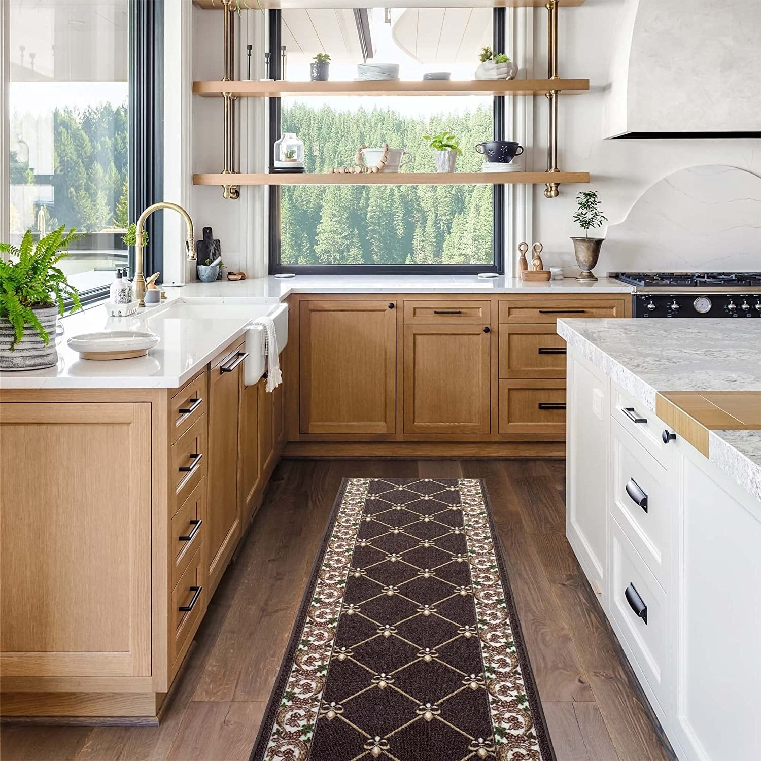 Apportez une touche d'élégance à votre intérieur avec notre tapis d'escalier antidérapant Fleur de Lys sur mesure. Fabriqué en Turquie à partir de polyamide 100 % et doté d'un envers en caoutchouc, ce tapis tissé à la machine allie qualité de fabrication et durabilité. Son motif unique aux tons bruns, bleus et noirs en fait le tapis idéal pour toutes les pièces de la maison : couloirs, cuisines, salles de bains, chambres et entrées. Choisissez la longueur qui vous convient le mieux et profitez de son envers antidérapant pour une sécurité optimale.