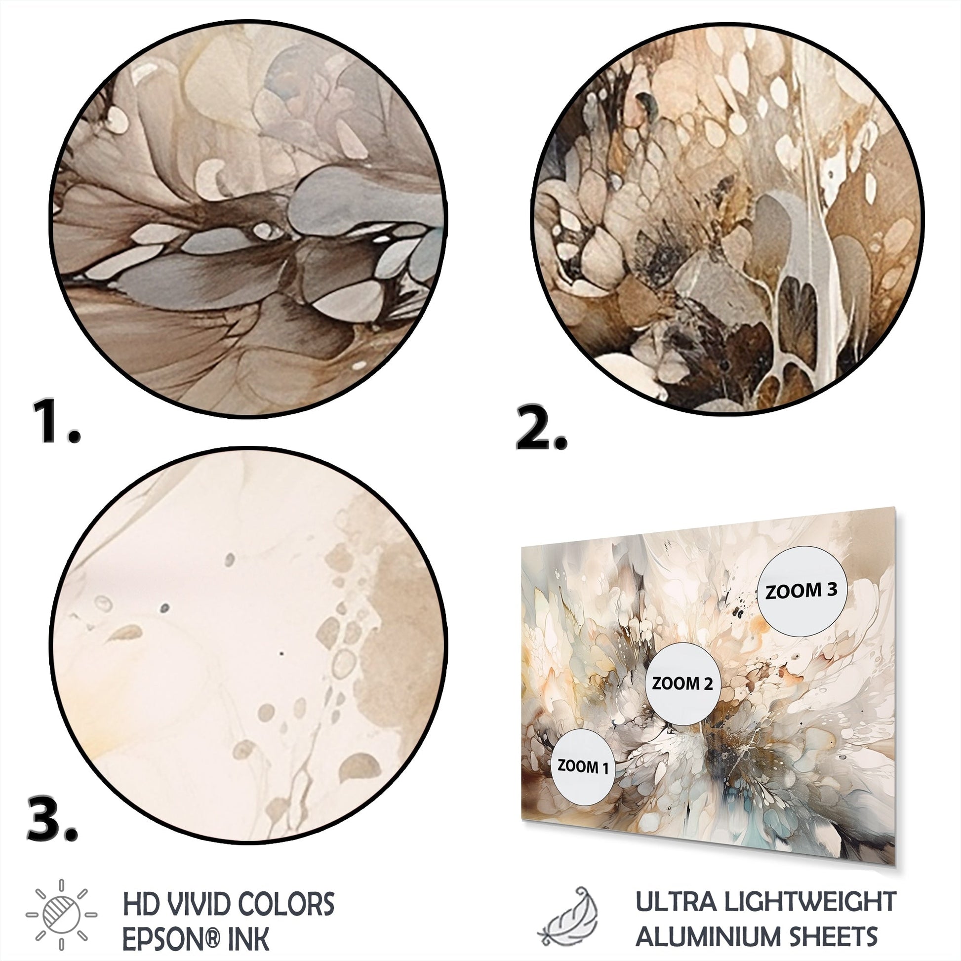 - Des images numériques de haute qualité sont créées directement dans un panneau en aluminium brillant, produisant une impression époustouflante et captivante dans la finition brillante du métal