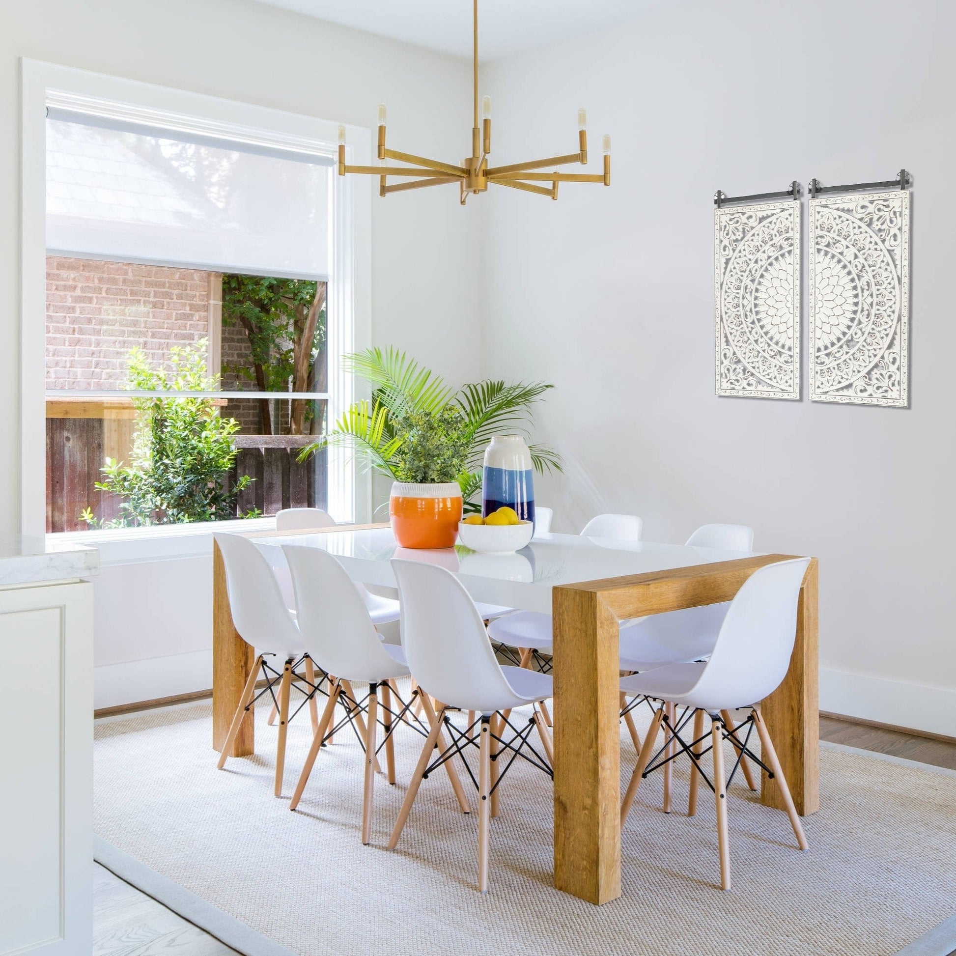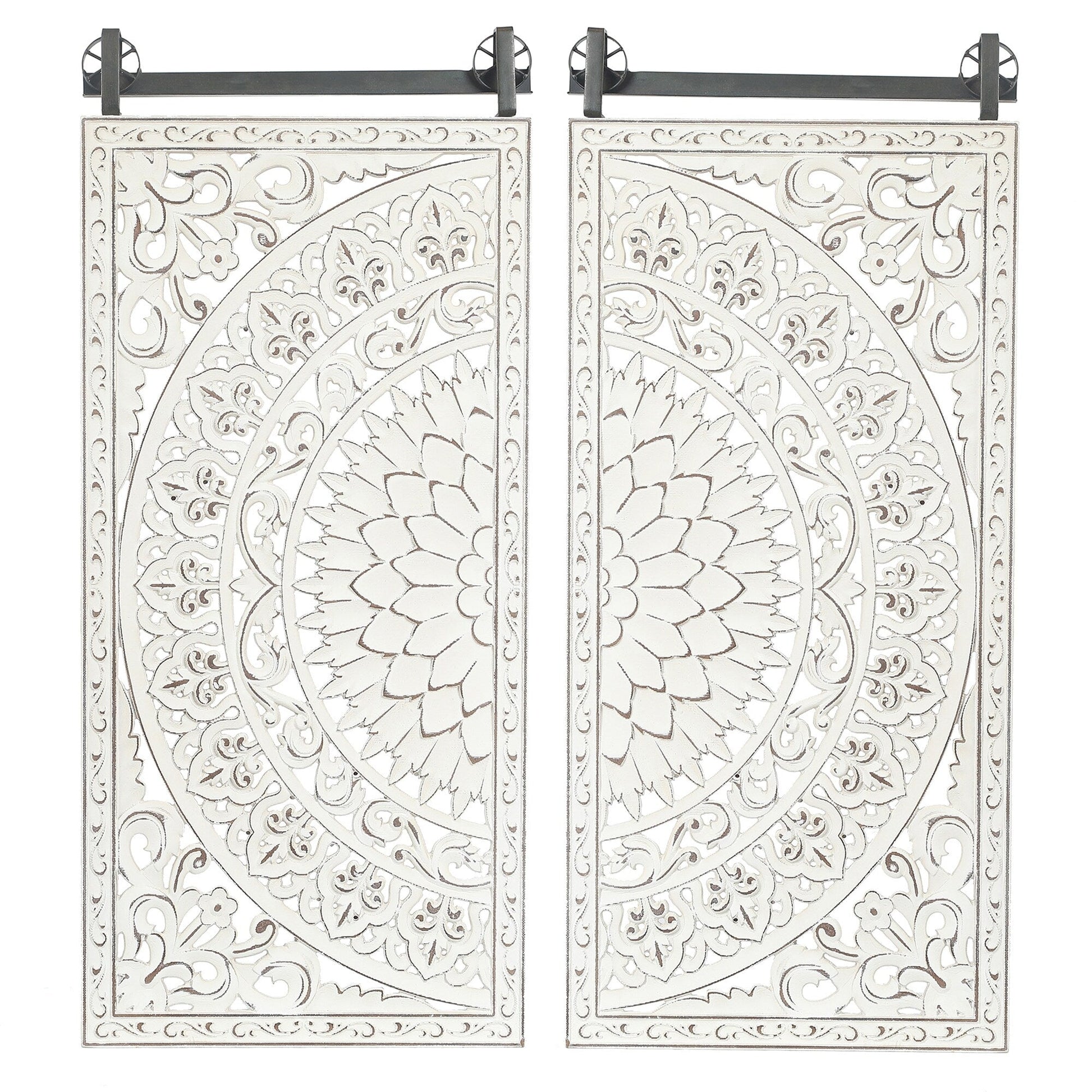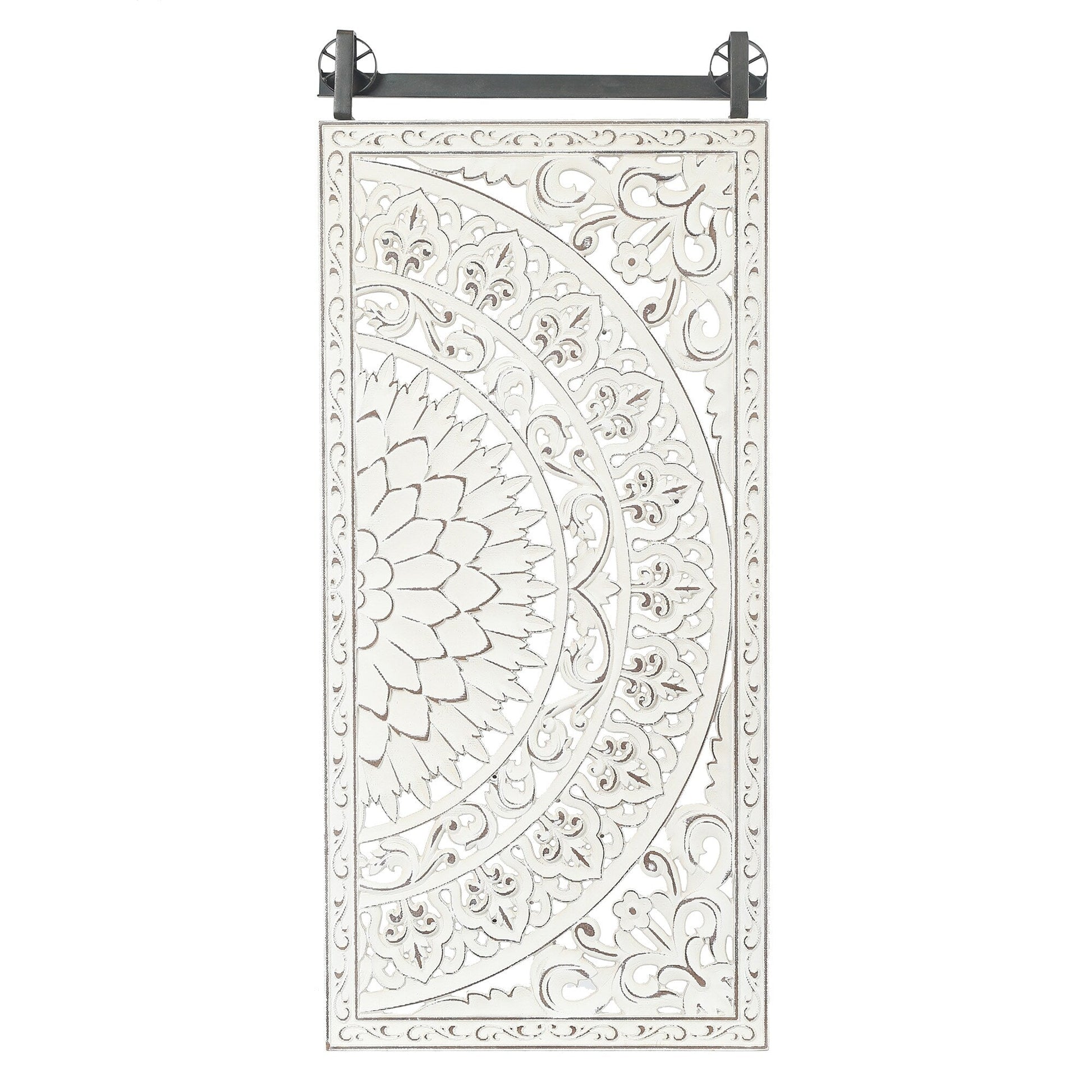 Envie d'ajouter une touche de fraîcheur, de charme et de romantisme à votre décoration intérieure ? Ne cherchez plus et optez pour ce magnifique ensemble de deux pièces de décoration murale à motifs floraux sculptés à la main. Chaque pièce est fabriquée avec soin à partir de bois manufacturé de haute qualité, avec un magnifique motif floral sculpté et des détails en relief d'un blanc ivoire doux rehaussé de touches de brun pour plus de profondeur et un charme vintage. Les panneaux sont fixés à une solide barre en fer noir patiné, conférant à l'ensemble un style campagnard moderne. Facile à fixer grâce à deux anneaux en D métalliques, cette magnifique décoration murale attirera tous les regards et s'harmonisera avec tout type de décoration intérieure. Ne vous contentez pas d'un mur vide et ennuyeux ; donnez-lui l'éclat qu'il mérite avec cette magnifique décoration murale florale.