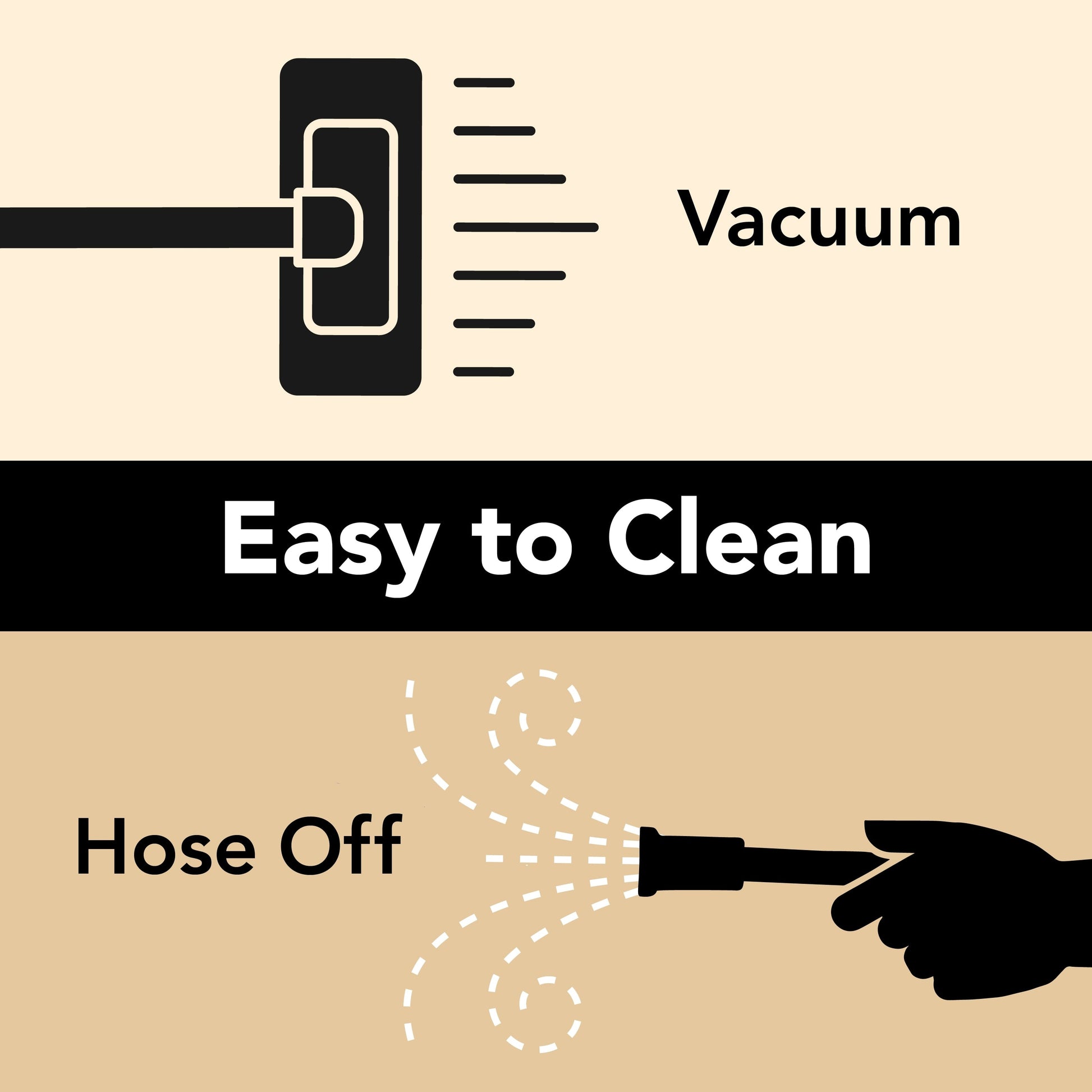 Conseils d'entretien : Passez régulièrement l'aspirateur ou le balai sur votre tapis pour éviter que la saleté ne s'incruste dans les fibres. Balayez également en dessous pour prévenir les dommages causés par la moisissure. Vous pouvez aussi le rincer au jet d'eau ; arrosez-le avec un tuyau d'arrosage et laissez-le sécher au soleil. Retournez-le pour faire sécher l'autre côté, si nécessaire. Assurez-vous que le tapis soit entièrement sec avant de le remettre en place, surtout à l'intérieur, car la moisissure peut se développer dans les zones humides.