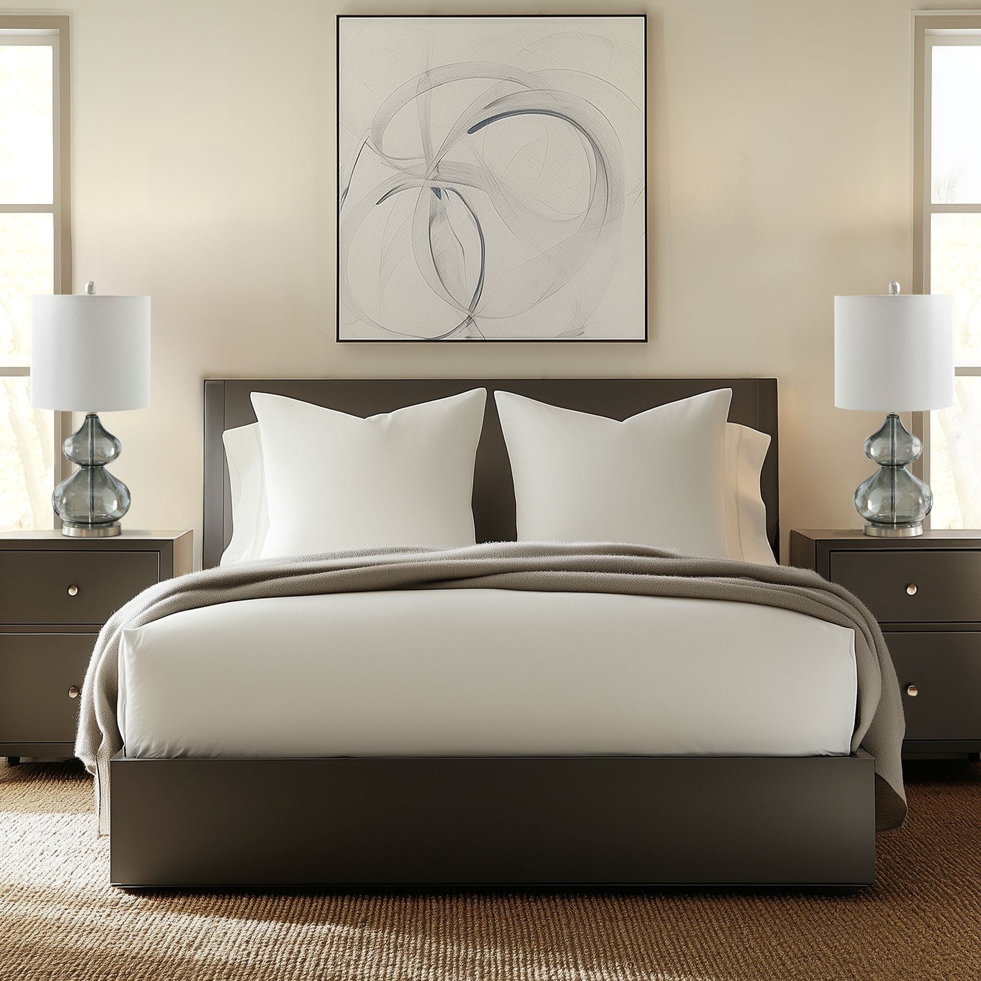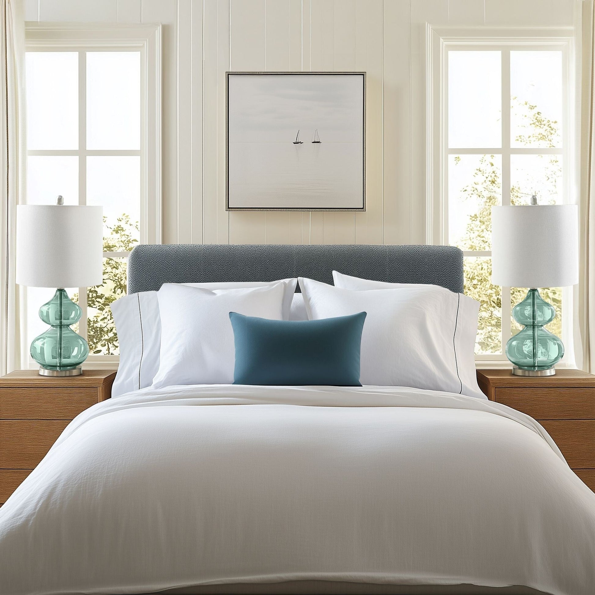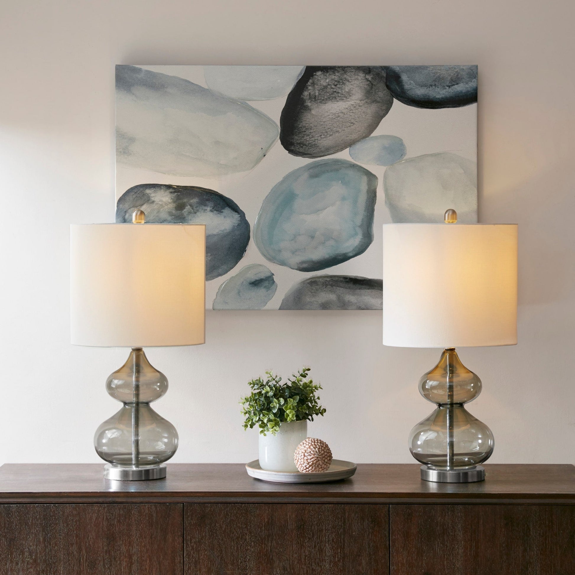 L'ensemble de lampes de table Ellipse de 510 Design apporte une élégance moderne à tous les espaces. Ce lot de deux lampes est composé de deux bases en verre en forme de calebasse, aux surfaces polies et aux touches de métal doré brossé. Le verre translucide diffuse doucement la lumière pour une ambiance chaleureuse. Chaque lampe est surmontée d'un abat-jour tambour en tissu blanc et d'un fleuron en métal doré pour une touche sophistiquée. Polyvalentes, elles offrent un éclairage vers le haut et vers le bas et sont équipées de deux ampoules LED 9 W basse consommation. Idéales pour le salon, la chambre ou le bureau. Nettoyage des taches uniquement. Garantie limitée de 2 ans.