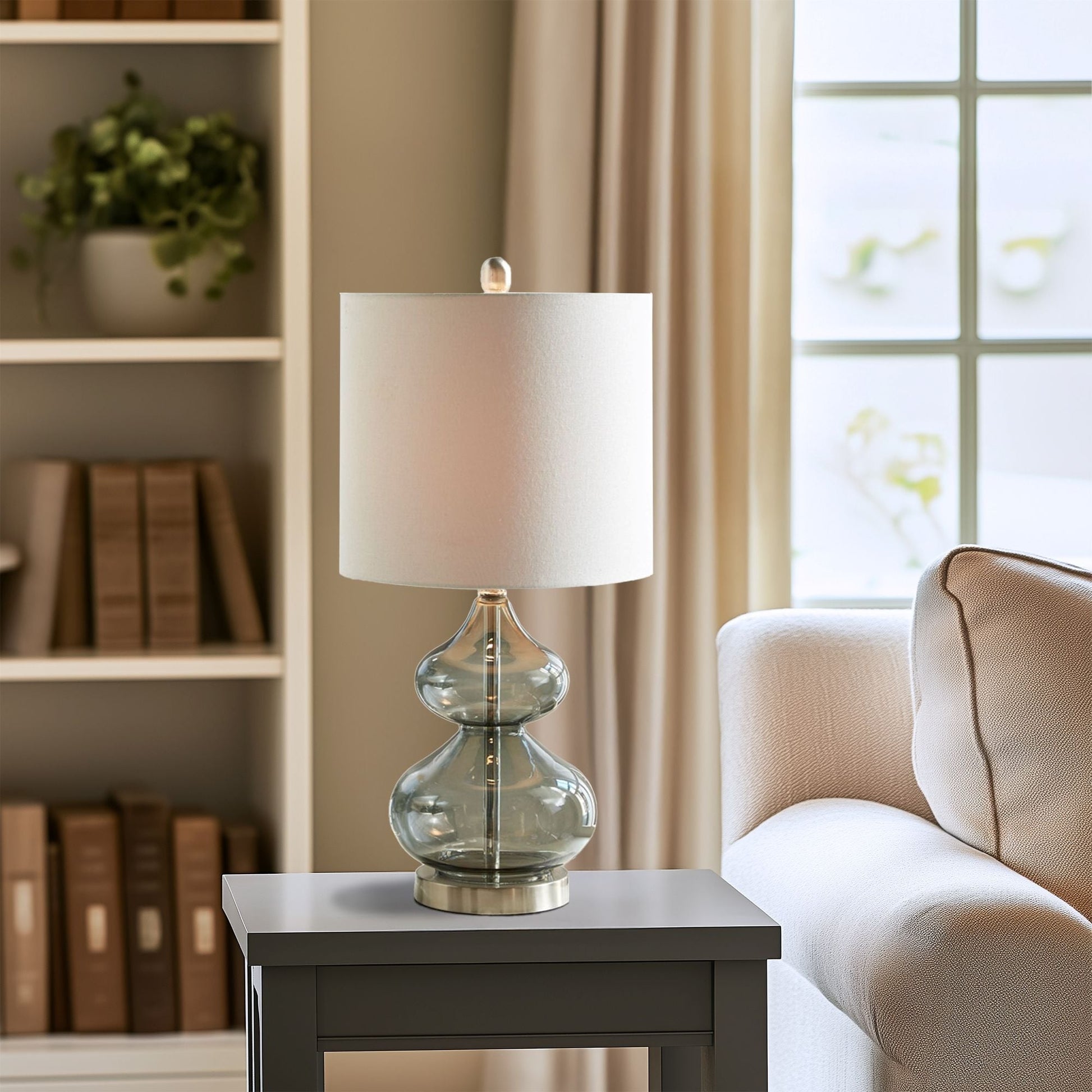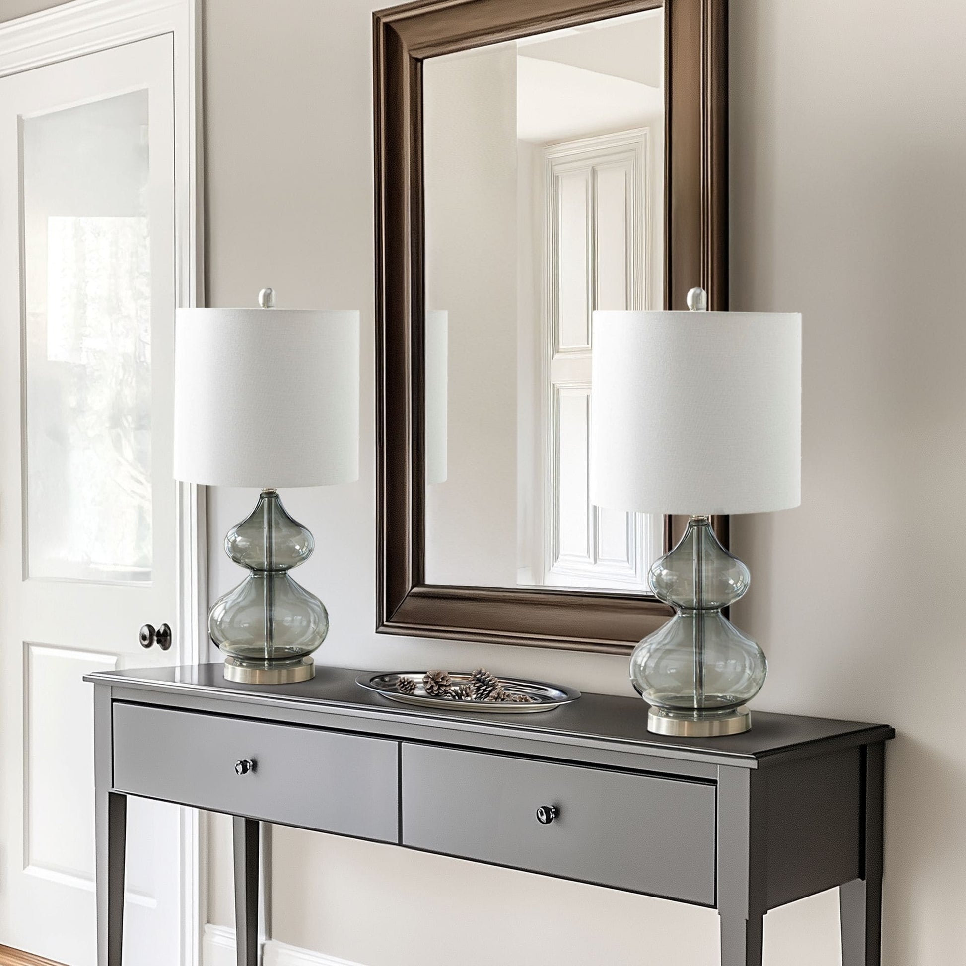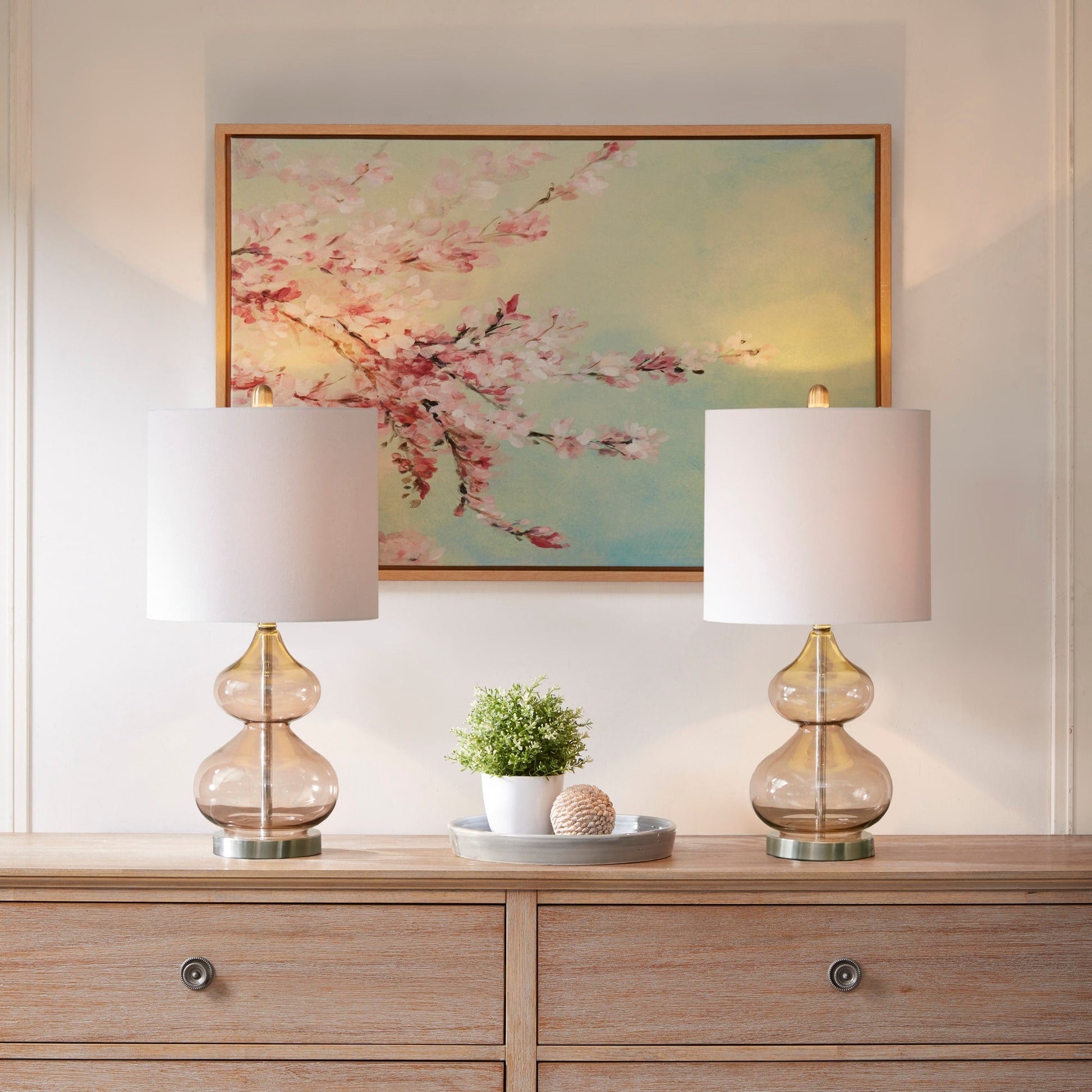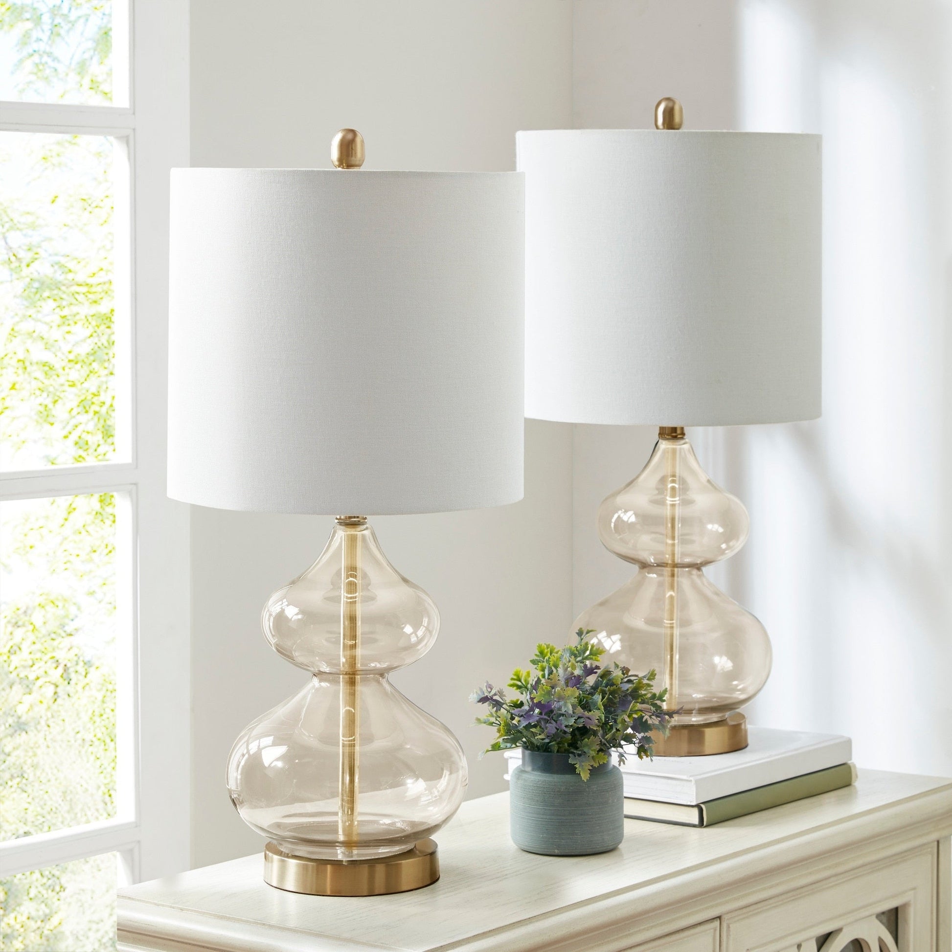 - Ensemble de 2 lampes de table avec une base en verre en forme de gourde à double empilement, une surface polie lisse et des accents en métal doré brossé pour un look élégant et moderne