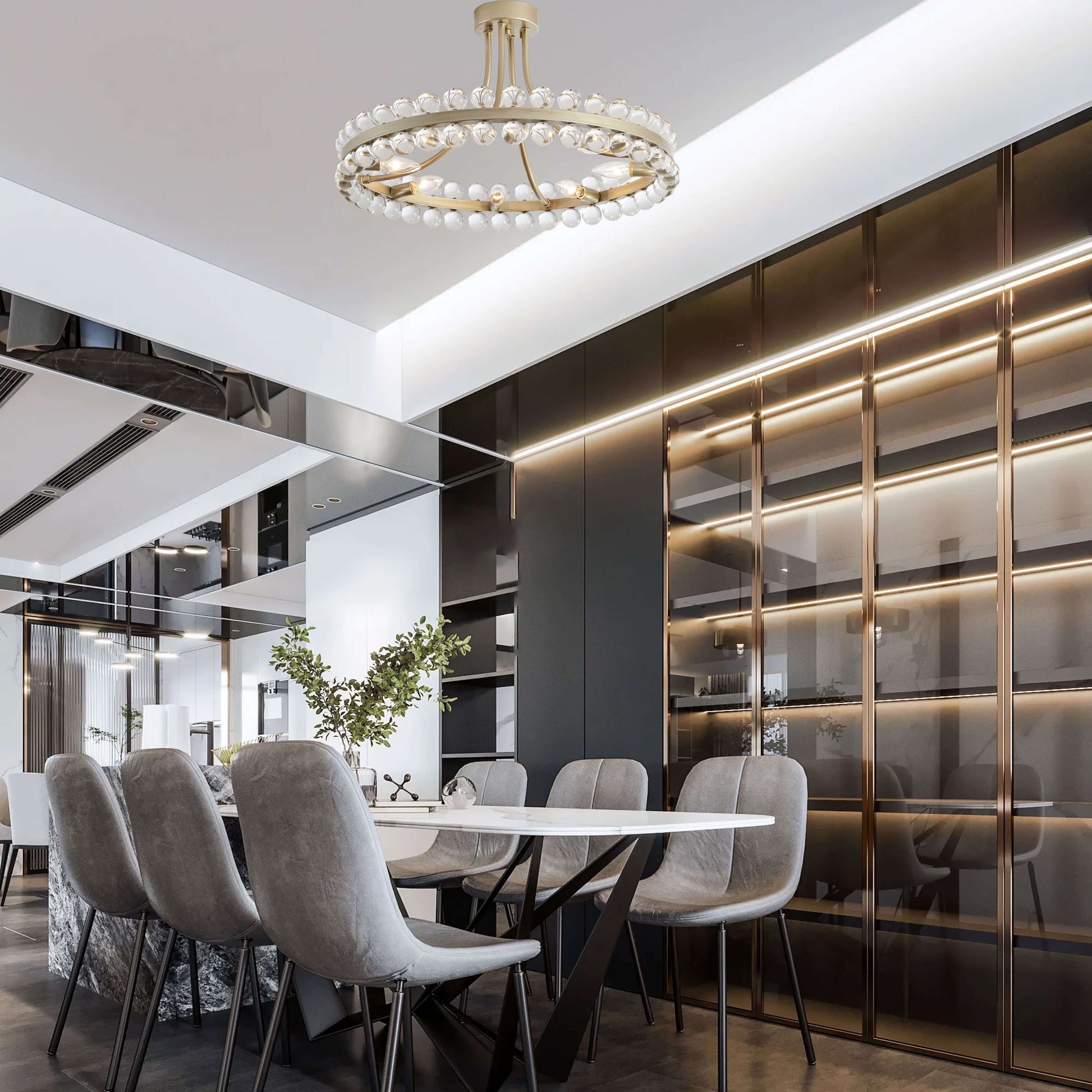 Illuminez votre intérieur avec le semi-encastré Elvira à 8 lumières en cristal, motif roue de chariot. Ce lustre raffiné est doté d'un anneau en fer orné de boules de cristal, créant une allure captivante et sophistiquée. Polyvalent, ce modèle semi-encastré est parfait pour les plafonds bas et est compatible avec les variateurs d'intensité. Il nécessite huit (8) ampoules de 40 watts (E12) (non fournies), compatibles avec les éclairages à incandescence, halogènes ou LED. Sublimez n'importe quel espace, de la salle à manger à l'entrée, avec le lustre Elvira, une alliance parfaite d'élégance intemporelle et de modernité !