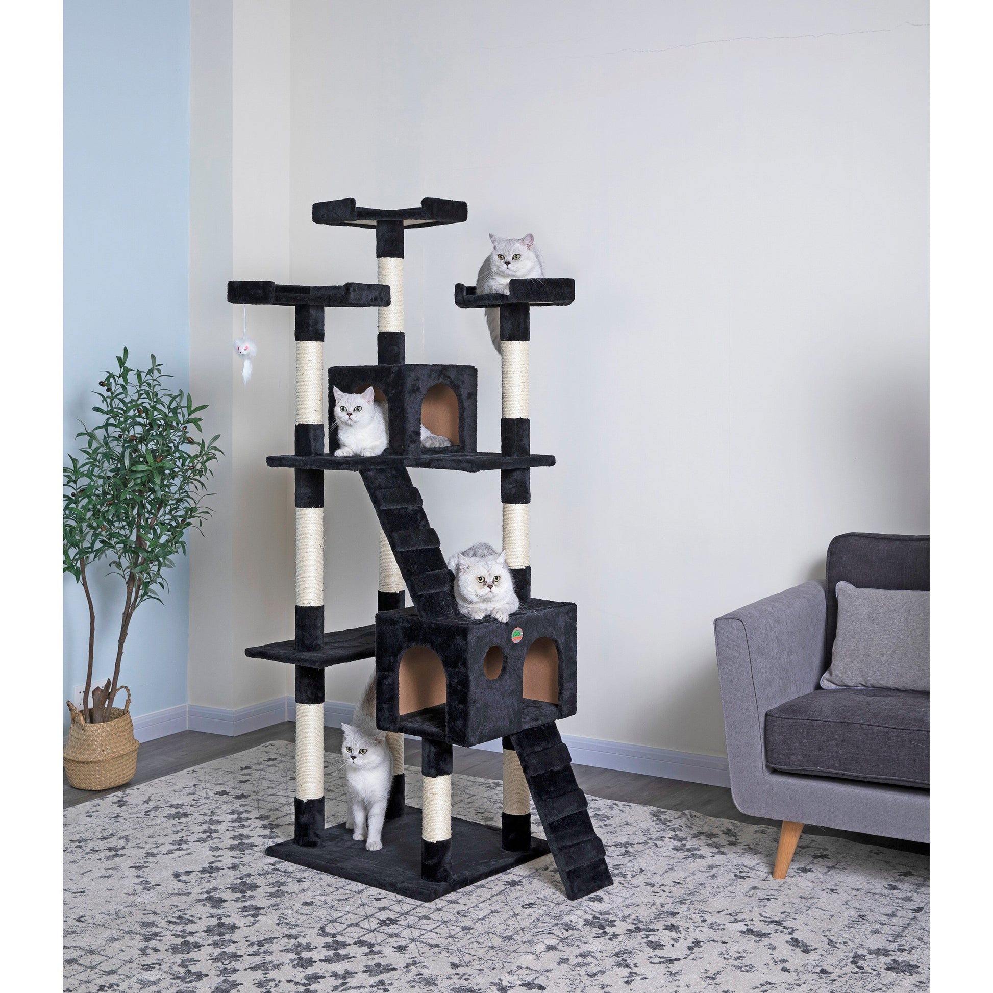 Offrez à votre chat un moment de détente et de bien-être avec cet arbre à chat de 183 cm. Ses différents niveaux lui offrent de multiples possibilités d'exploration, et deux cachettes lui assurent un refuge à l'abri du chien. Les plateformes sont recouvertes de fausse fourrure pour un confort optimal, et les poteaux à griffer en sisal permettent à votre chat d'entretenir ses griffes tout en préservant vos meubles.