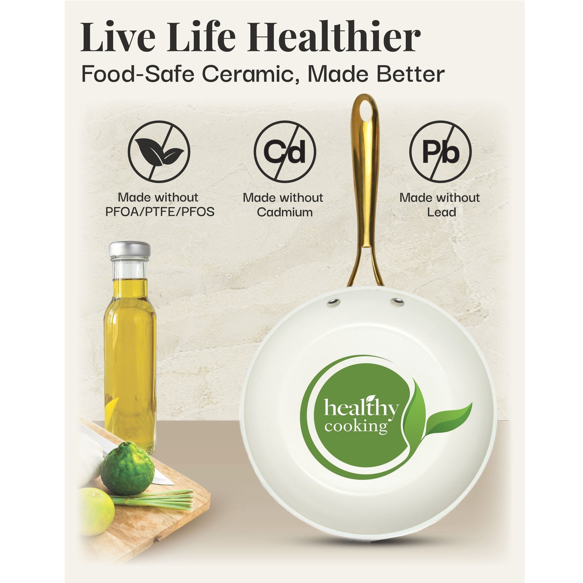 - Ensemble de 10 casseroles et poêles antiadhésives en céramique comprenant : une poêle de 8,5 pi, une poêle à frire de 10,25 pi avec couvercle en verre trempé, une casserole de 1,5 pinte avec couvercle en verre trempé, une casserole de 2,5 pintes avec couvercle en verre trempé, une marmite de 5 pintes avec couvercle en verre trempé, un insert vapeur en acier inoxydable pour marmite.