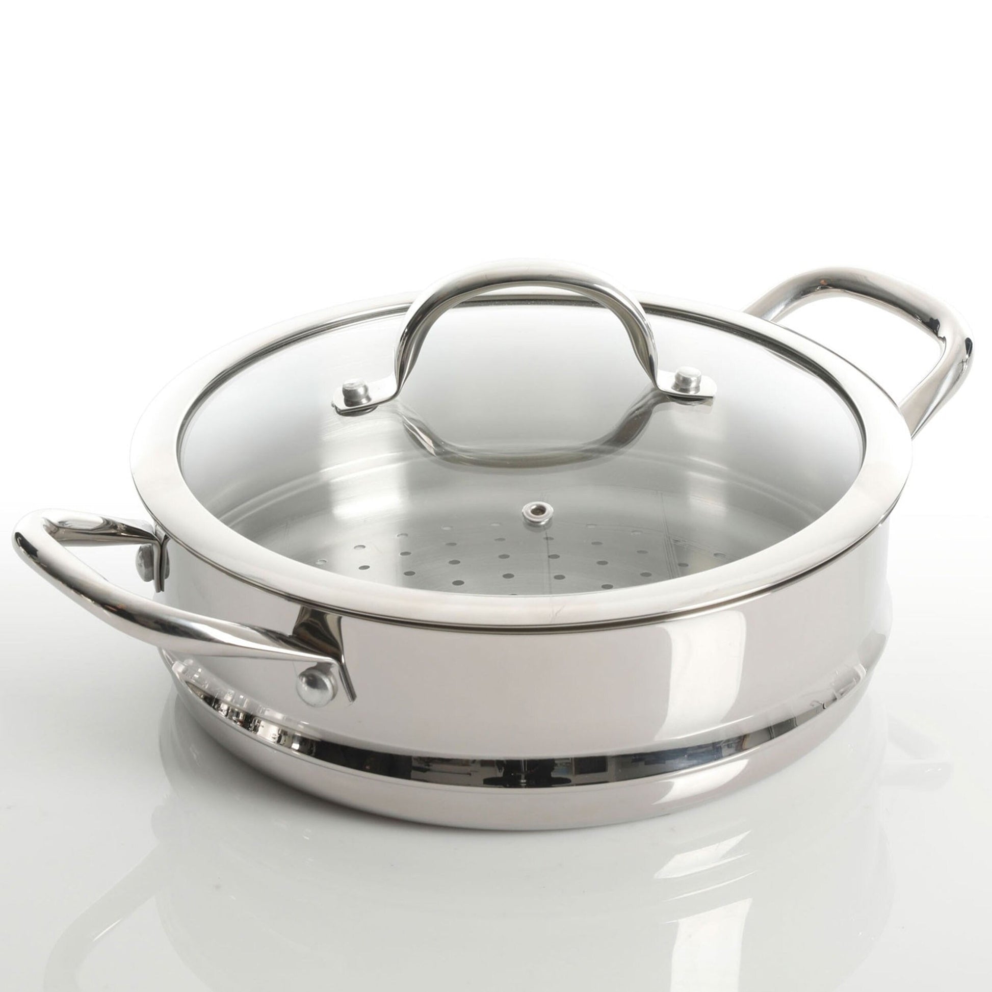 Cuisinez et créez vos plats les plus originaux avec cette batterie de cuisine 10 pièces en acier inoxydable épais. Fournissant tous les éléments essentiels, cette batterie de cuisine permet aux chefs de tous niveaux de frire, sauter, saisir, cuire à la vapeur, bouillir et cuire au four. Leur corps en acier inoxydable épais est compatible avec toutes les plaques de cuisson. La cocotte et les poêles sont équipées de couvercles en verre résistant à la chaleur avec évents pour une surveillance facile de la cuisson ! Cuire des légumes à la vapeur, faire sauter des nouilles, frire du poulet, remuer des sauces tomates savoureuses et plus encore. Ensemble : Batterie de cuisine Matériau : acier inoxydable épais Finition : polie Poignées : acier inoxydable Compatible avec toutes les plaques de cuisson Lavage à la main uniquement L'ensemble comprend : Une casserole de 1 pinte avec poignée et couvercle de 6,25 pouces Une casserole de 2,5 pintes avec poignée et couvercle de 7 pouces Une poêle à frire de 9,5 pouces avec poignée de 7,25 pouces Un panier vapeur avec poignées de 2 pouces Une sauteuse de 4,4 pintes avec poignées de 8,5 pouces et 2 pouces et couvercle Un faitout de 5 pintes avec poignées et couvercle Dimensions par article : Casserole de 1 pinte : 12,25 pouces de longueur, 6 pouces de largeur, 3 pouces de hauteur, capacité de 1 pinte, poids de 1 lb Casserole de 2,5 pintes : 14,25 pouces de longueur, 7,75 pouces de largeur, 4 pouces de hauteur, capacité de 2,5 pintes, 1,75 lb Poêle à frire de 9,5 po : longueur de 17 po, largeur de 10 po, hauteur de 2,25 po, capacité de 48 oz, poids de 2 lb. Insert de cuisson à la vapeur : longueur de 14 po, largeur de 10 po, hauteur de 3 po, poids de 1 lb. Sauteuse de 4,4 pintes : longueur de 22 po, largeur de 11,5 po, hauteur de 3 po, capacité de 4,4 pintes, poids de 3,55 lb. Faitout de 5 pintes : longueur de 13,75 po, largeur de 10 po, hauteur de 4,5 po, capacité de 5 pintes, poids de 2,8 lb.