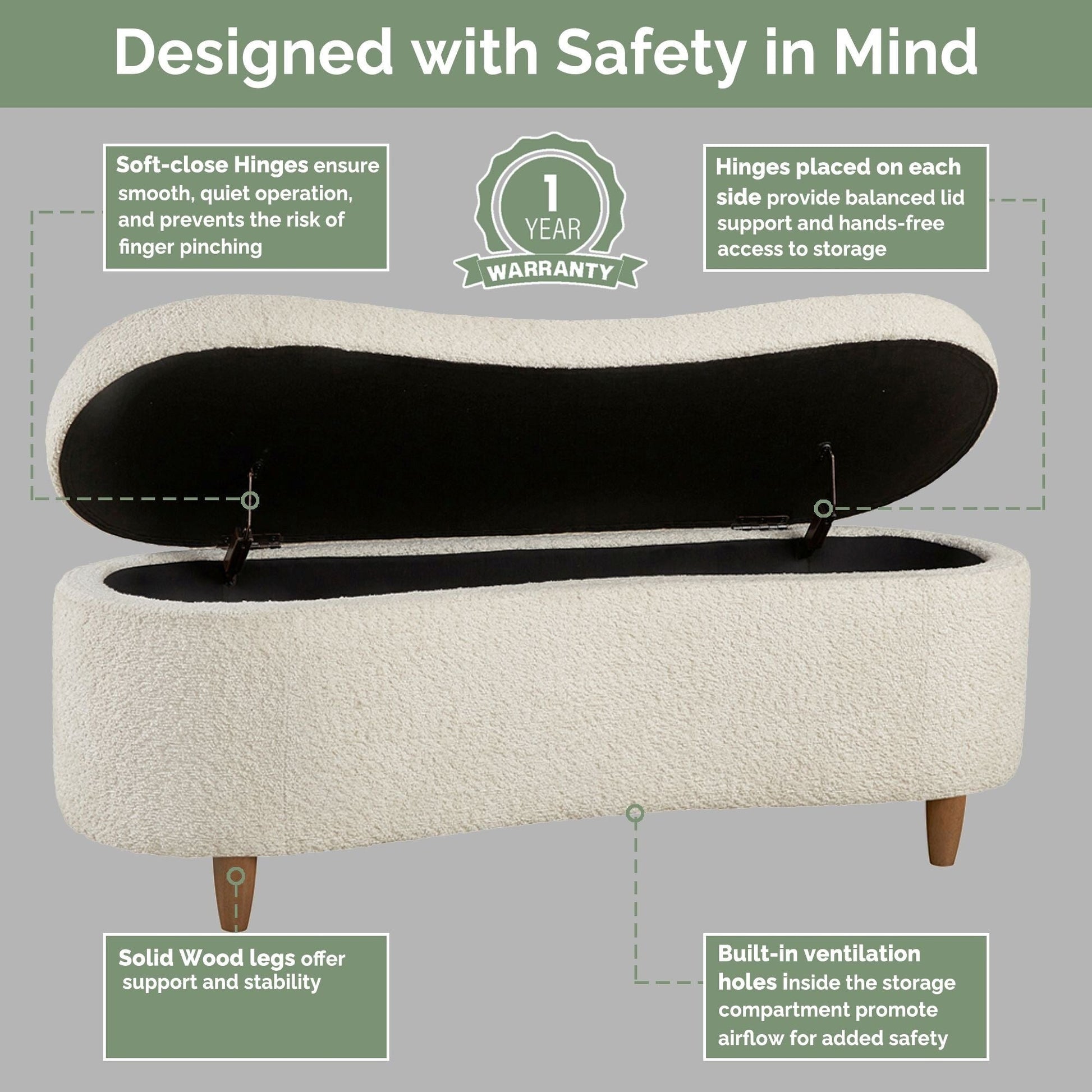 - Les charnières de sécurité à fermeture douce empêchent le claquement et prolongent la durée de vie du banc