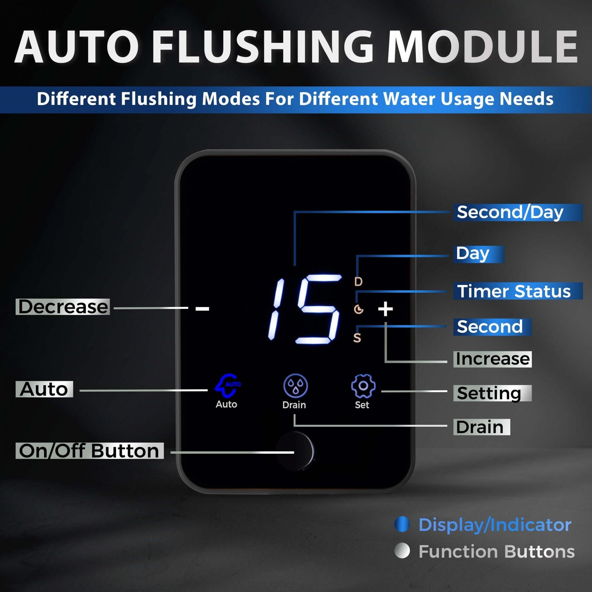 - [Module de rinçage automatique] Le filtre à eau domestique iSpring WSP100ARJ est doté d'un module de rinçage automatique intégré (double alimentation) qui permet de gagner du temps et de l'énergie lors de l'entretien courant. Choisissez entre les modes automatique, semi-automatique et manuel sur l'écran tactile HD pour permettre au système de se rincer automatiquement selon un programme prédéfini.