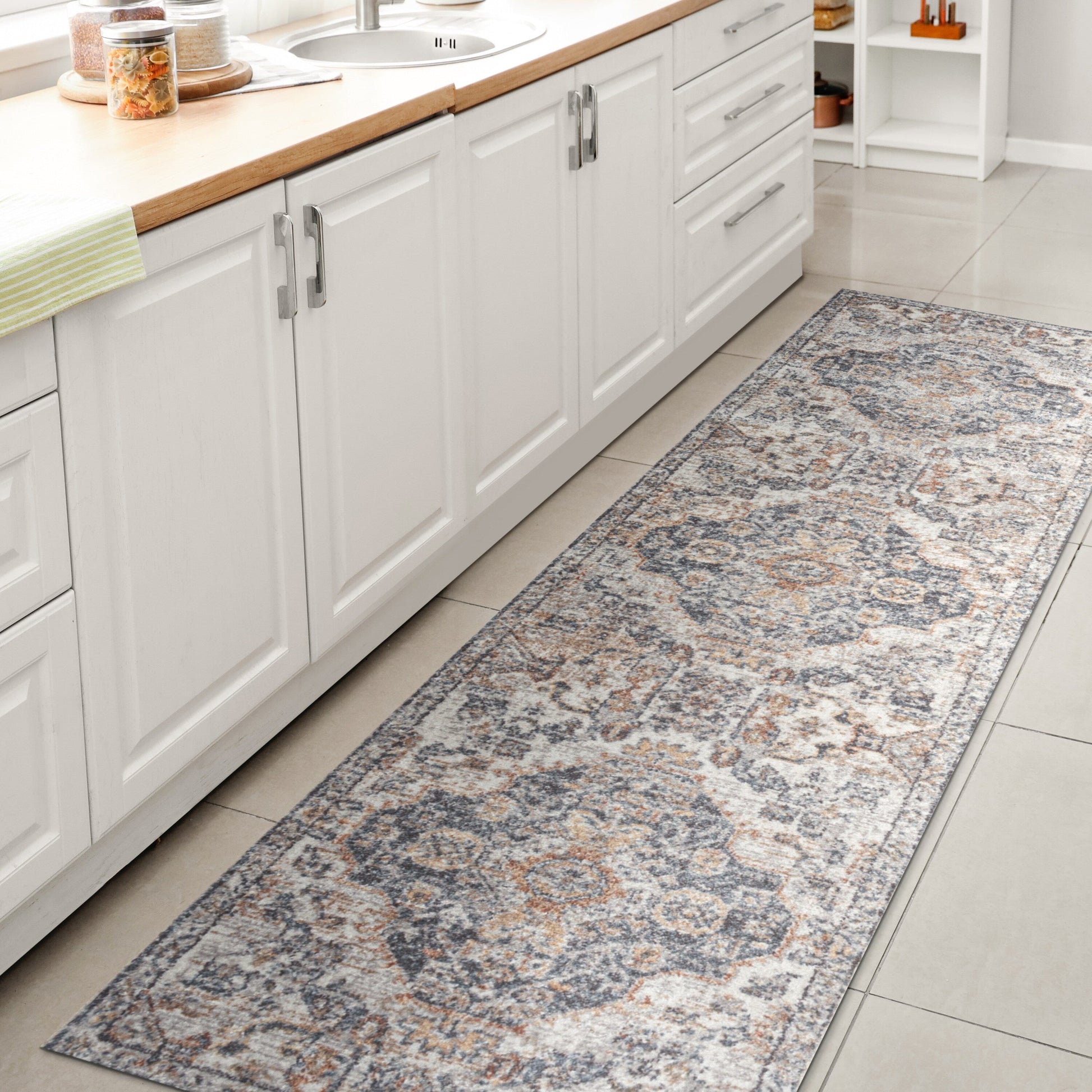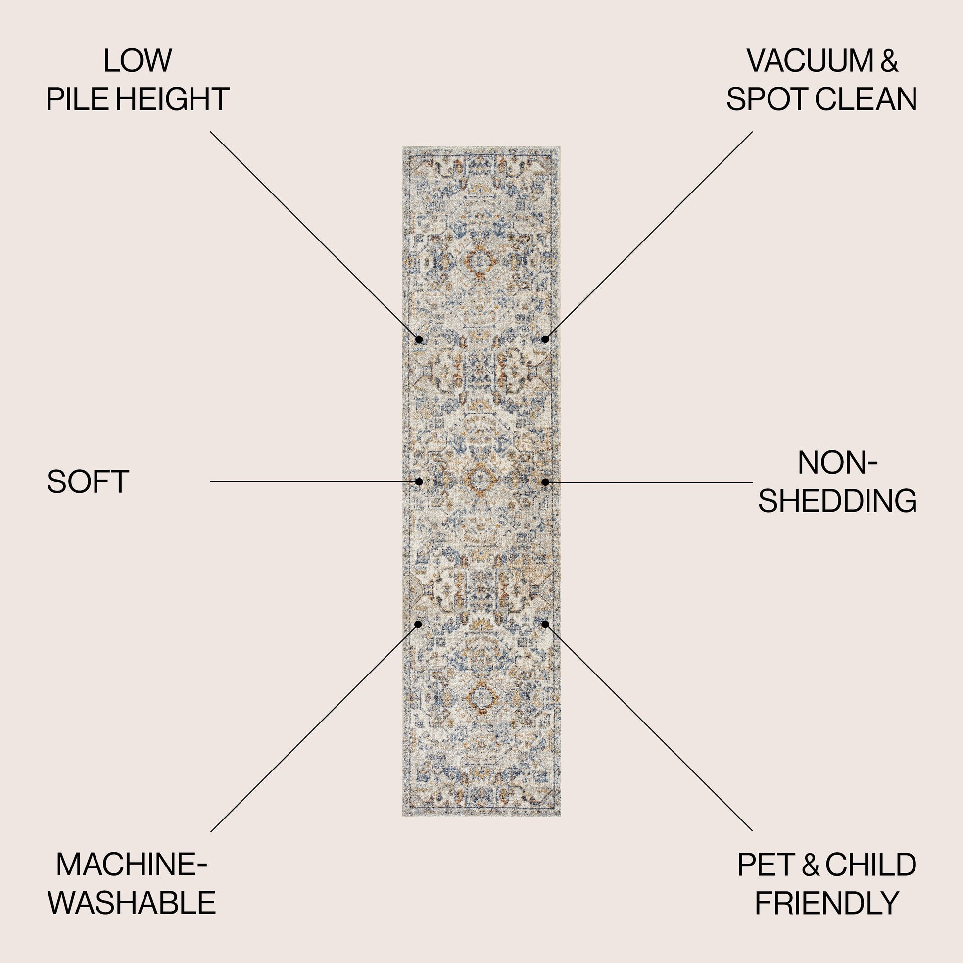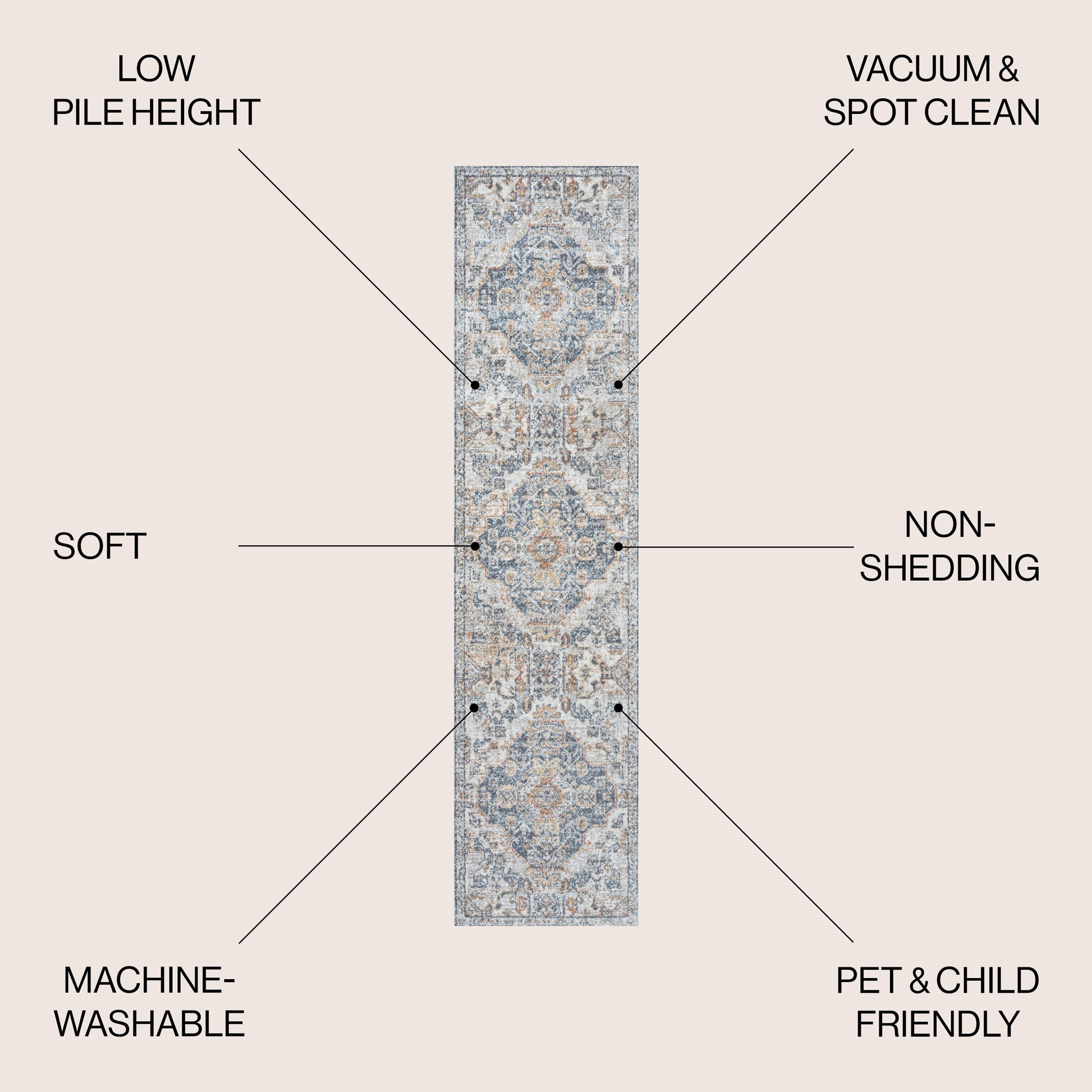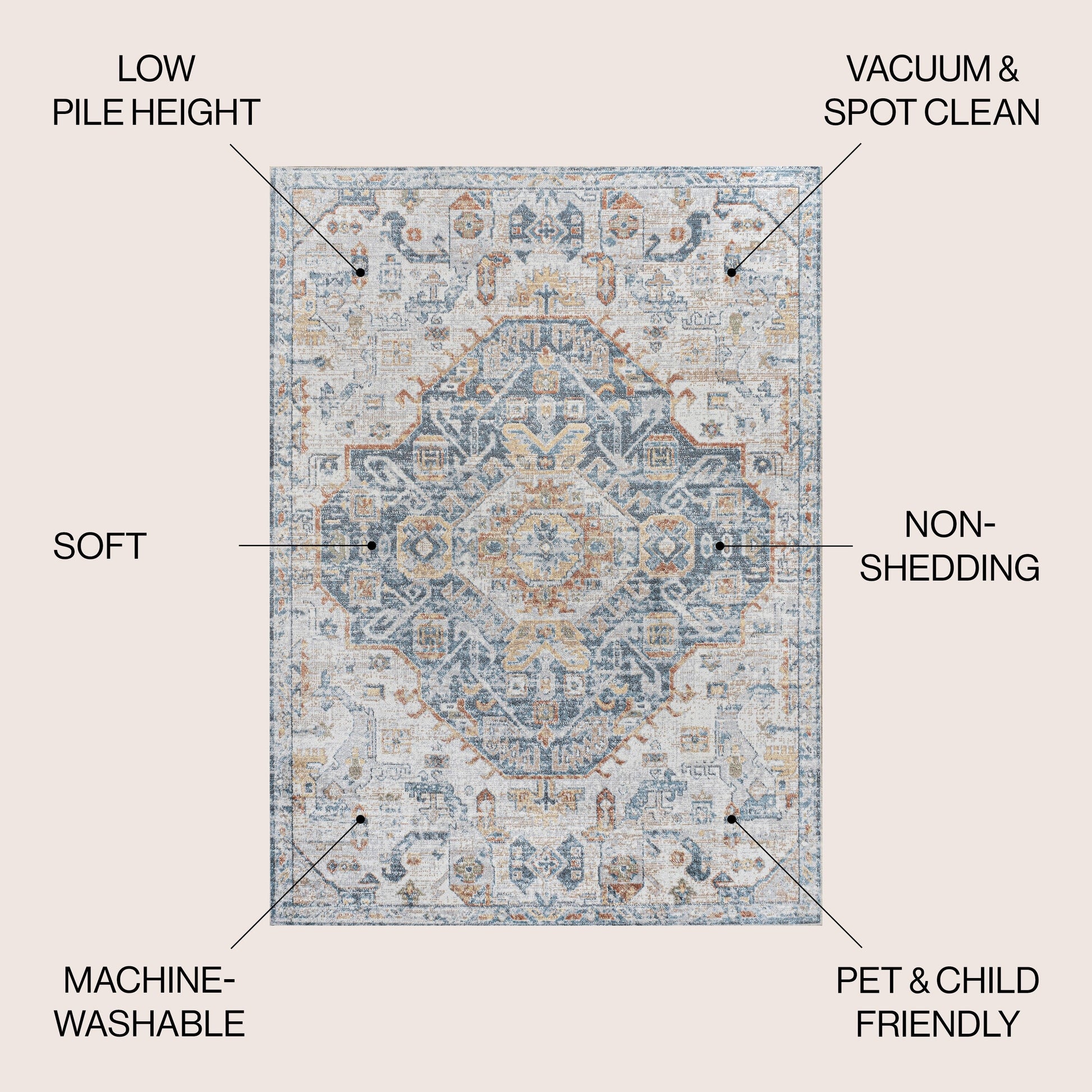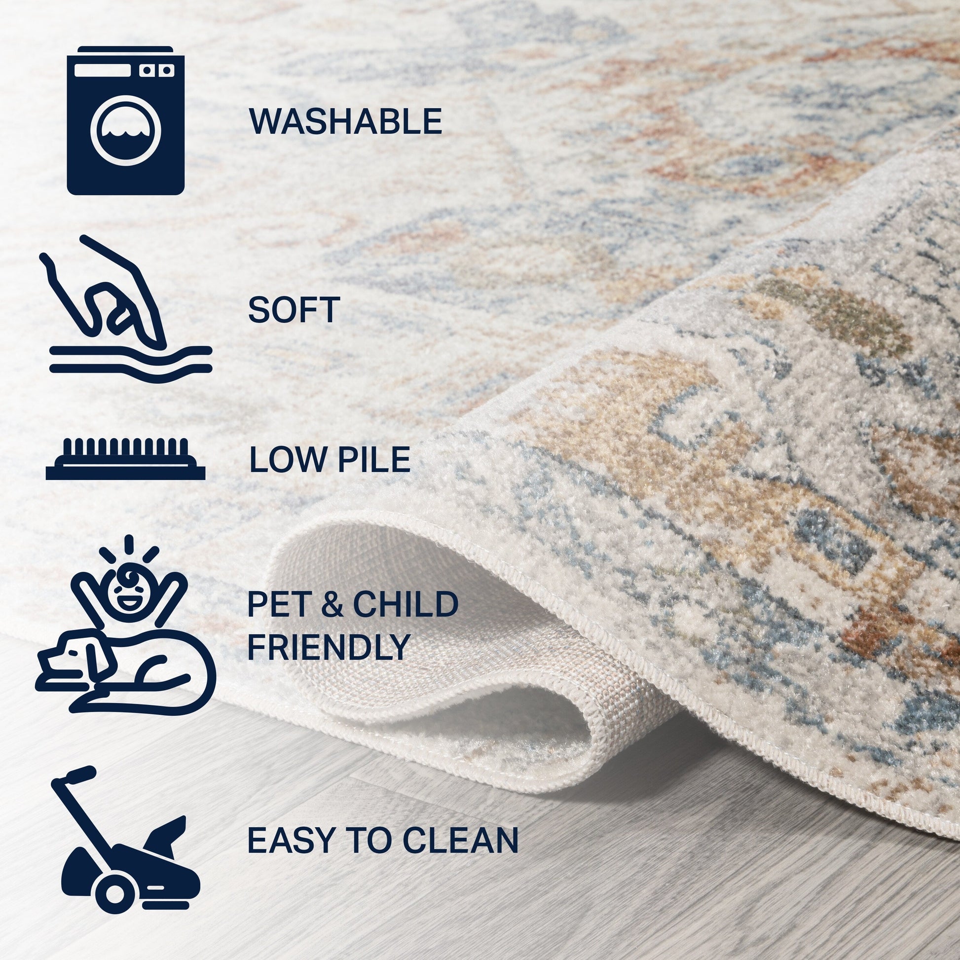 - Tapis lavable en machine, en polyester – utiliser une lessive douce sans agent blanchissant ; sécher à l’air libre