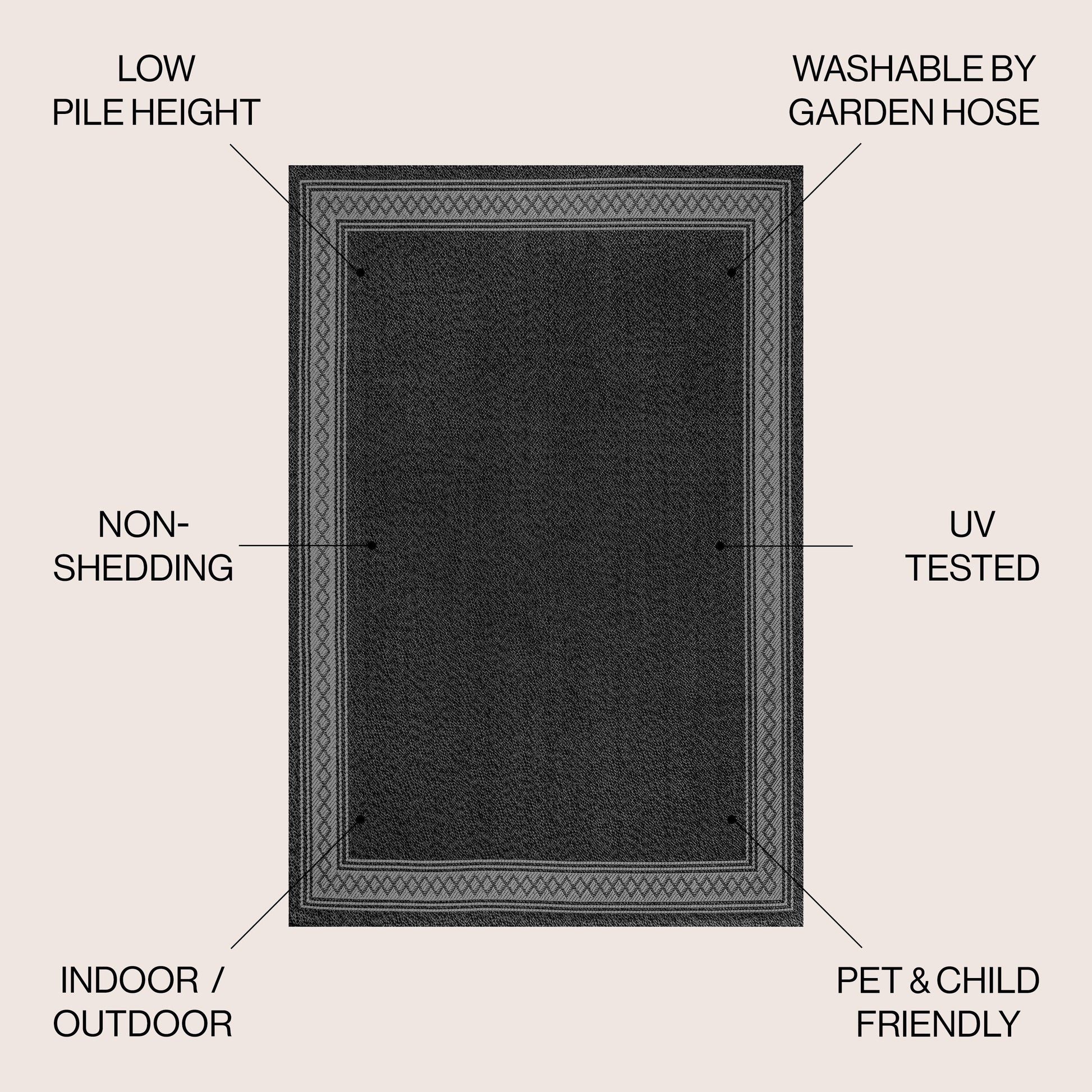 Ce tapis uni unique, orné d'une bordure géométrique en losanges, allie classicisme et modernité. Son design bicolore est tissé dans un tissu résistant à poils courts, idéal pour l'intérieur comme pour l'extérieur. Ce tapis, adapté aux animaux de compagnie, apportera une touche d'originalité à votre salon, salle à manger, chambre ou véranda.