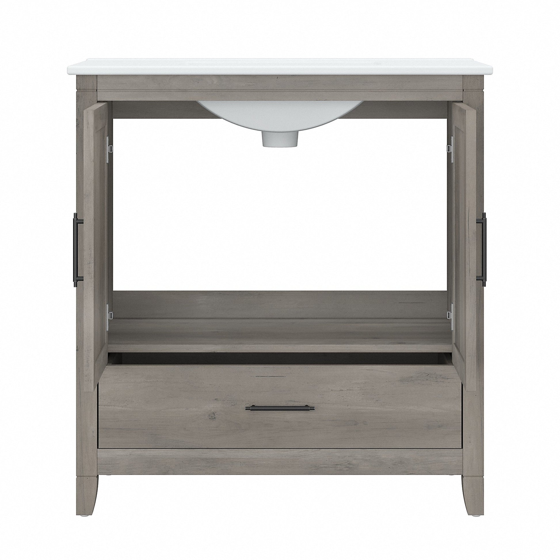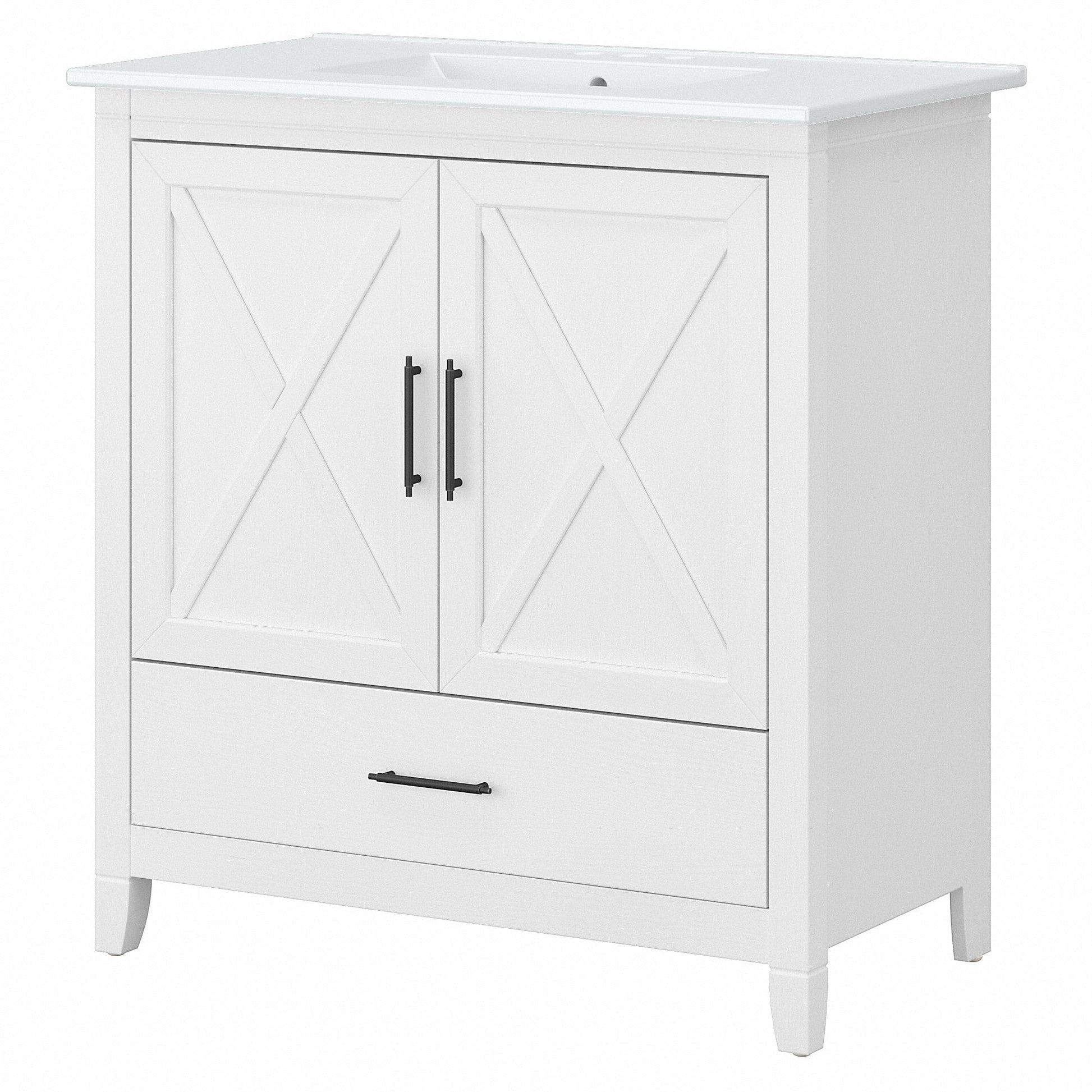 Le meuble-lavabo Bush Furniture Key West 32 W avec lavabo est idéal pour aménager votre intérieur dans un style rustique authentique. Affichant un design décontracté et rafraîchissant, ce meuble-lavabo mural allie esthétique, durabilité et praticité pour des années d'utilisation sans problème. Le lavabo est doté de trois trous pré-percés pour un robinet à entraxe de 10 cm (robinets non inclus), d'un trop-plein et d'une bonde de 4,4 cm. Le lavabo en céramique blanche se nettoie rapidement et facilement avec une éponge douce, de l'eau et du détergent. Profitez d'un tiroir et d'un meuble de rangement intégrés pour ranger vos produits de nettoyage, serviettes, articles de toilette et autres produits d'hygiène personnelle de manière organisée et accessible. Les portes du meuble sont dotées de charnières lisses de style européen et d'un motif en X unique, qui s'harmonise parfaitement avec les finitions gris bois flotté vieilli et frêne blanc de votre choix. Bénéficiant de la garantie fabricant Bush Furniture d'un an, ce petit meuble-lavabo a été rigoureusement testé pour sa sécurité, sa durabilité et ses performances. Le lavabo à encastrer est conforme aux normes UPC et CSA B45.1 pour les appareils sanitaires en céramique. L'assemblage et l'installation par l'utilisateur sont requis. Découvrez la collection complète de meubles de salle de bain style campagnard Key West et améliorez-la selon vos besoins avec une armoire à pharmacie, une armoire murale, un meuble de rangement au-dessus des toilettes, un meuble de rangement haut pour salle de bain et un panier à linge avec couvercle et doublure amovible (articles assortis vendus séparément).