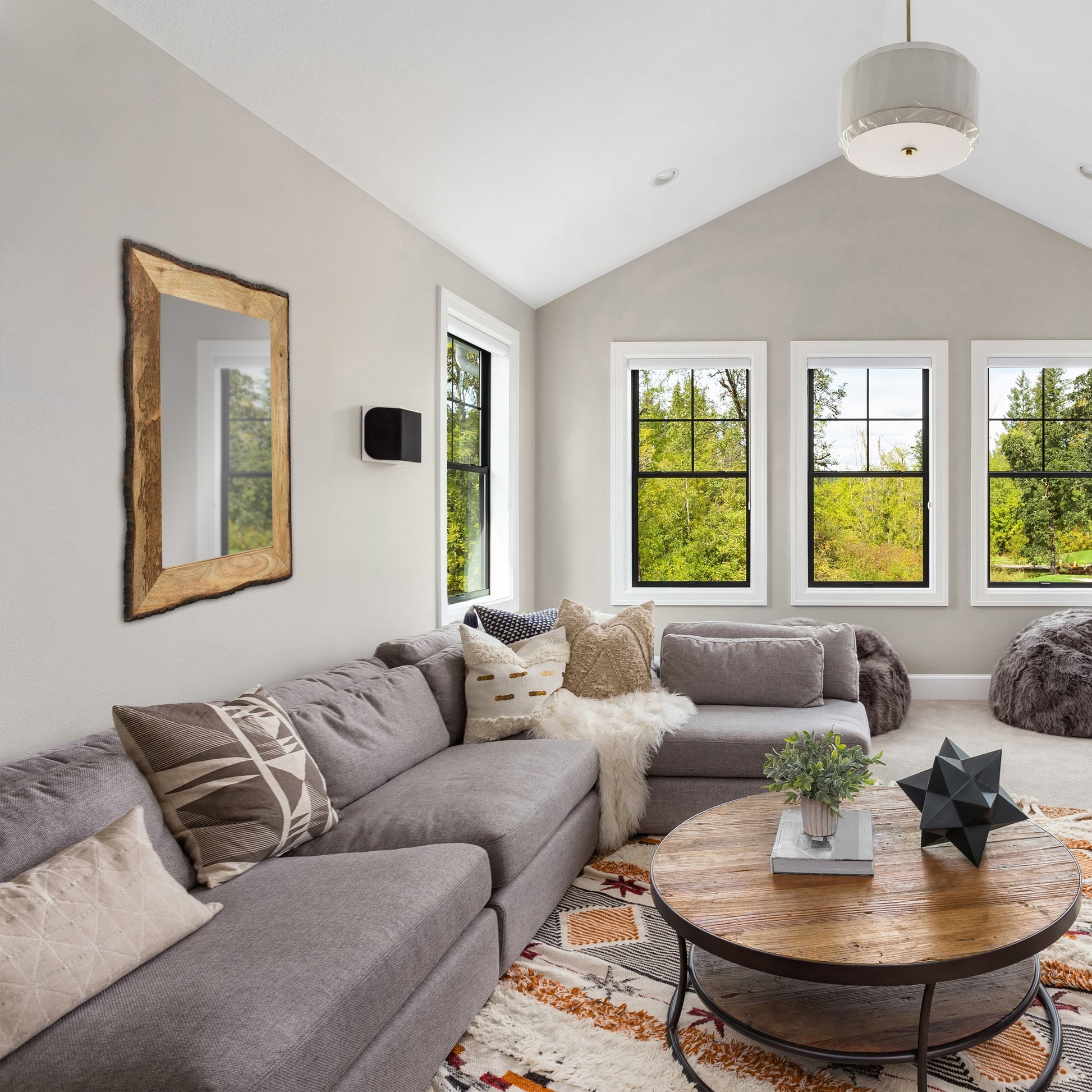 - Périmètre en bois brun texturé avec bois beige lisse entourant le verre