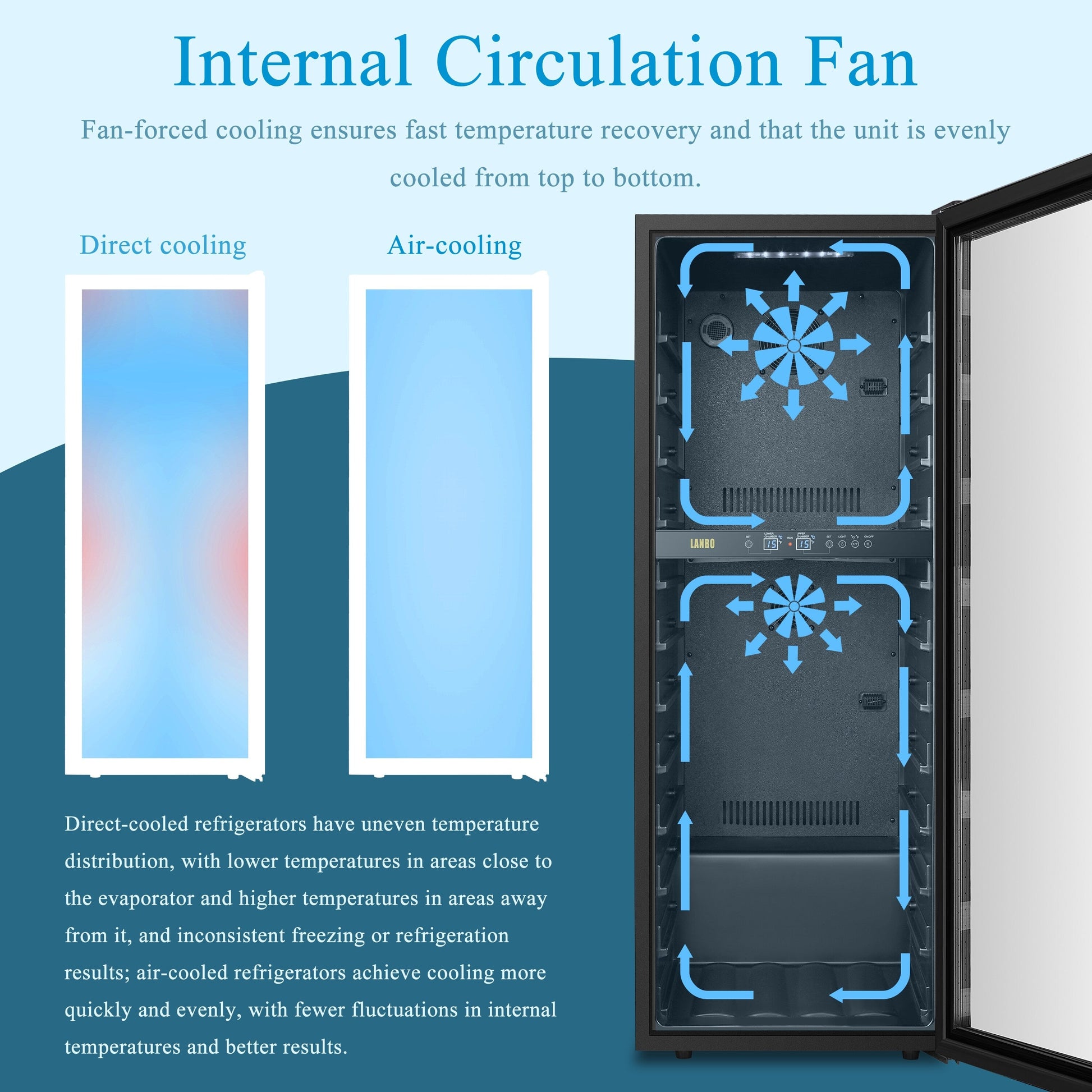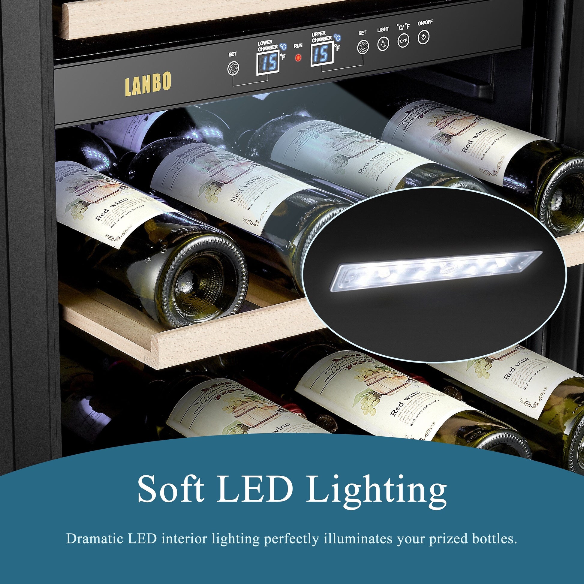 Cave à vin autonome Lanbo 20 pouces, 64 bouteilles, double zone, porte vitrée avec garniture en acier inoxydable et deux serrures de sécurité.