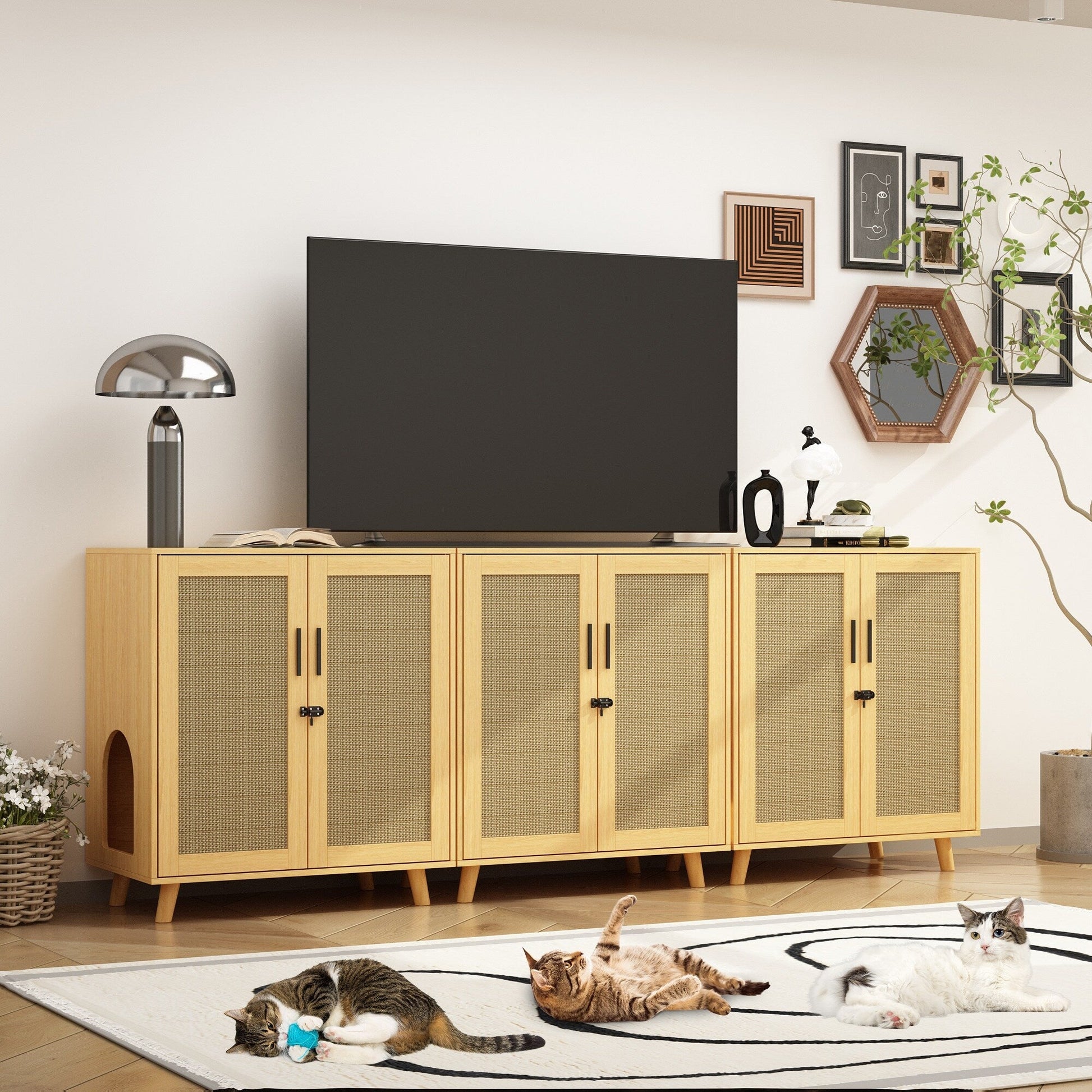【Maison pour chat multifonctionnelle 4 en 1】 Cette armoire en rotin à 2 portes est une maison polyvalente qui répond à divers besoins. Elle dissimule non seulement la litière de votre chat, mais offre également un espace privé et confortable à votre compagnon à quatre pattes. De plus, elle sert de meuble de rangement pour les friandises et les jouets de votre animal, ainsi que de table d'appoint pratique pour la salle de bain ou de table de chevet, s'intégrant parfaitement à votre décoration intérieure.