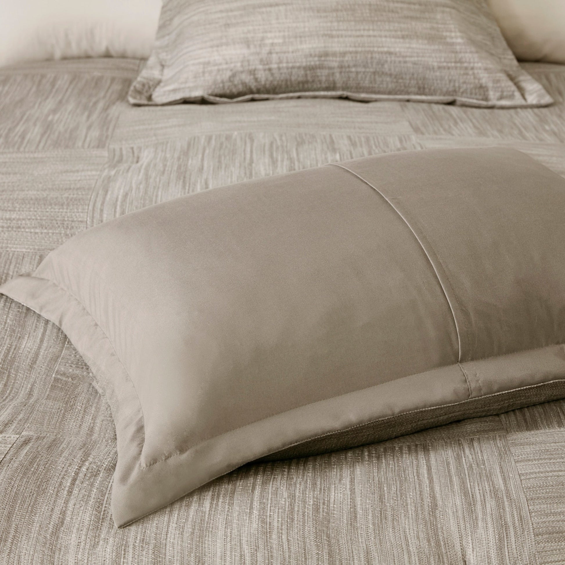 - Couette et taies d'oreiller assemblées, en microfibre douce brossée imprimée seersucker, envers uni en microfibre, garnissage 100 % polyester ; cache-sommier et oreillers en microfibre douce brossée