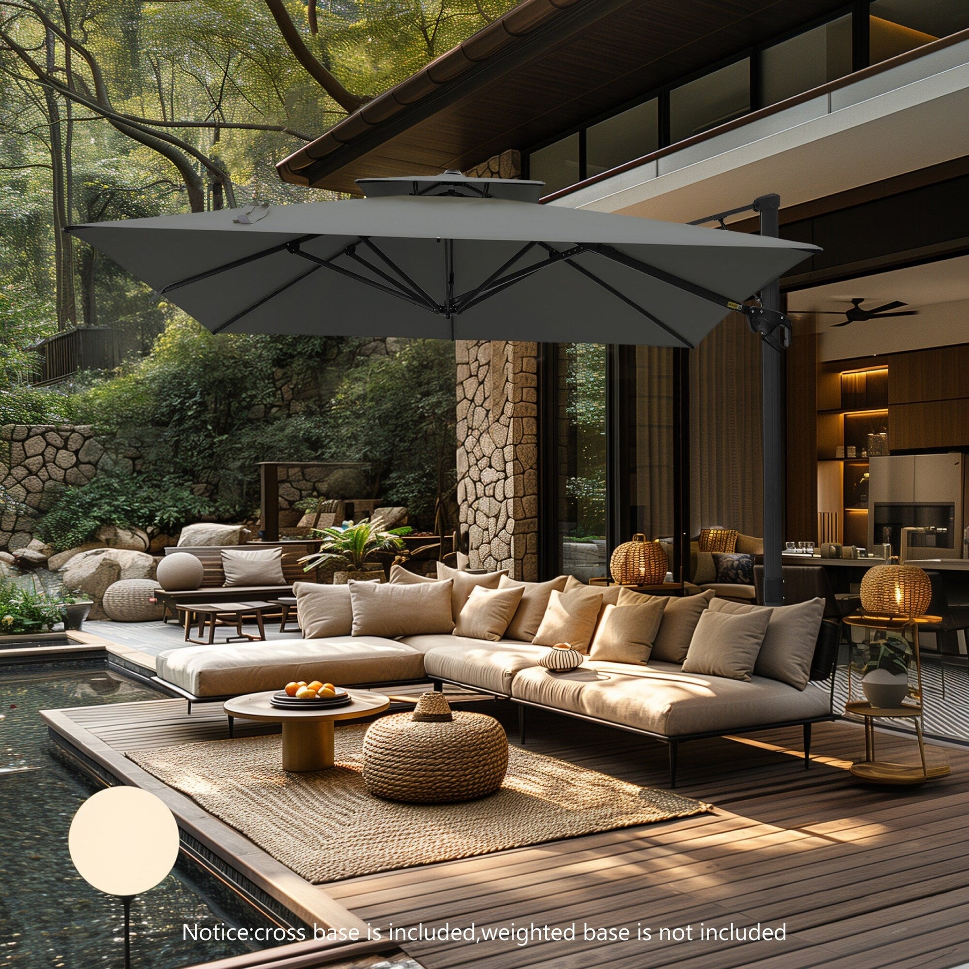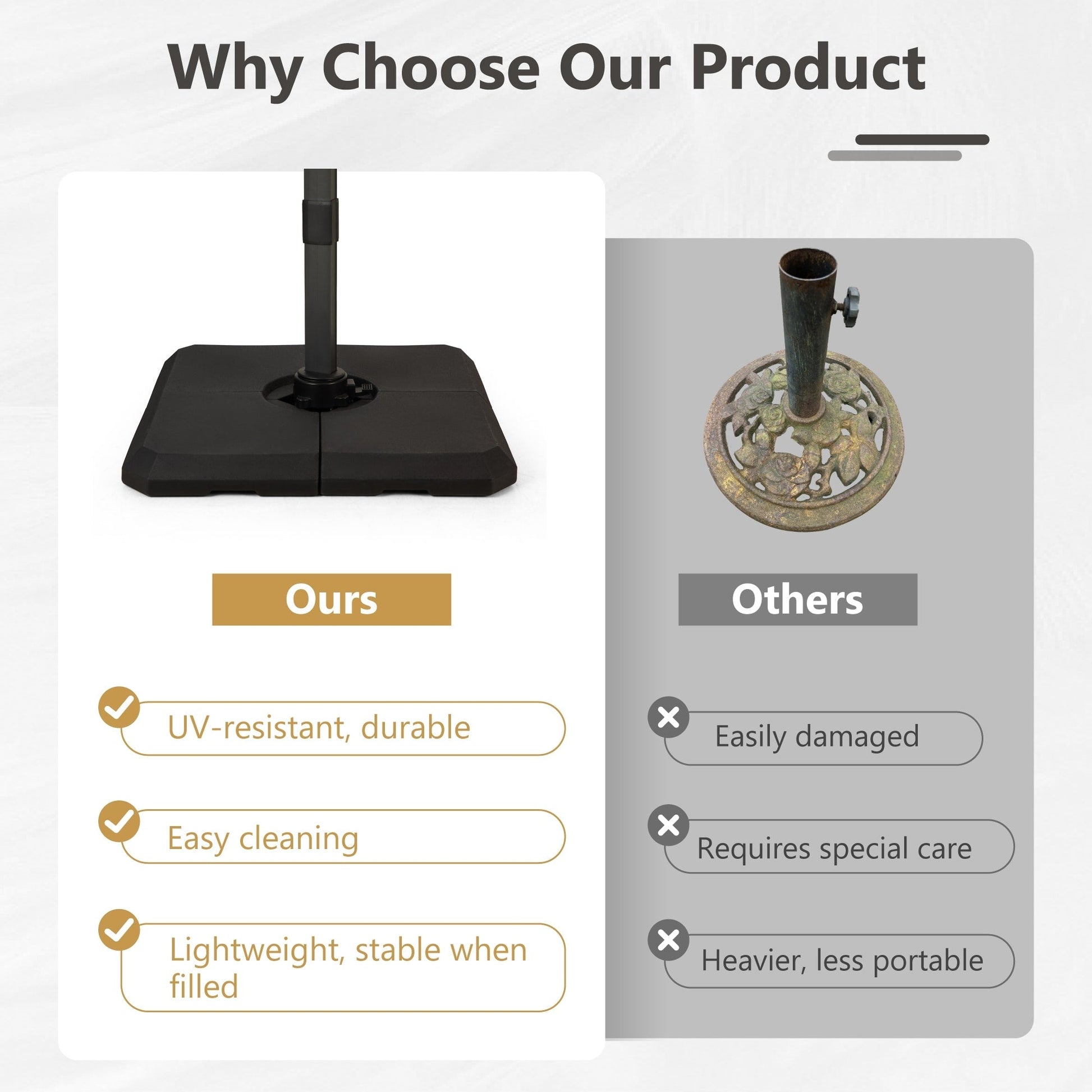 - Veuillez noter que tous les parapluies comprennent une base croisée et vous pouvez choisir de l'acheter avec une base lestée ou non.