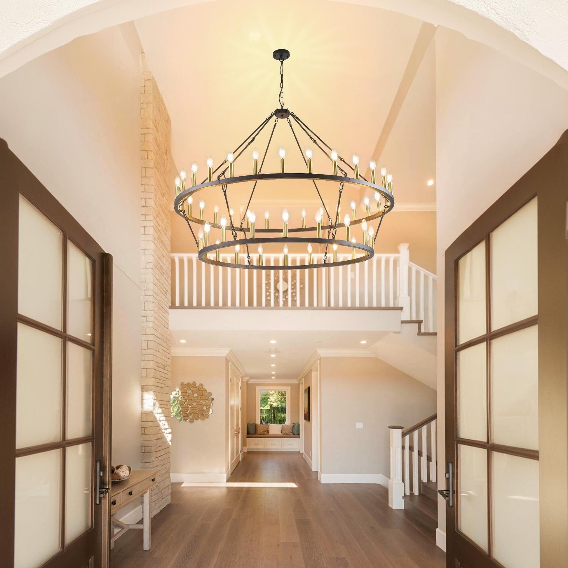 Lustre de ferme moderne à 2 niveaux, lustre rond en forme de roue de chariot, grand plafonnier haut.