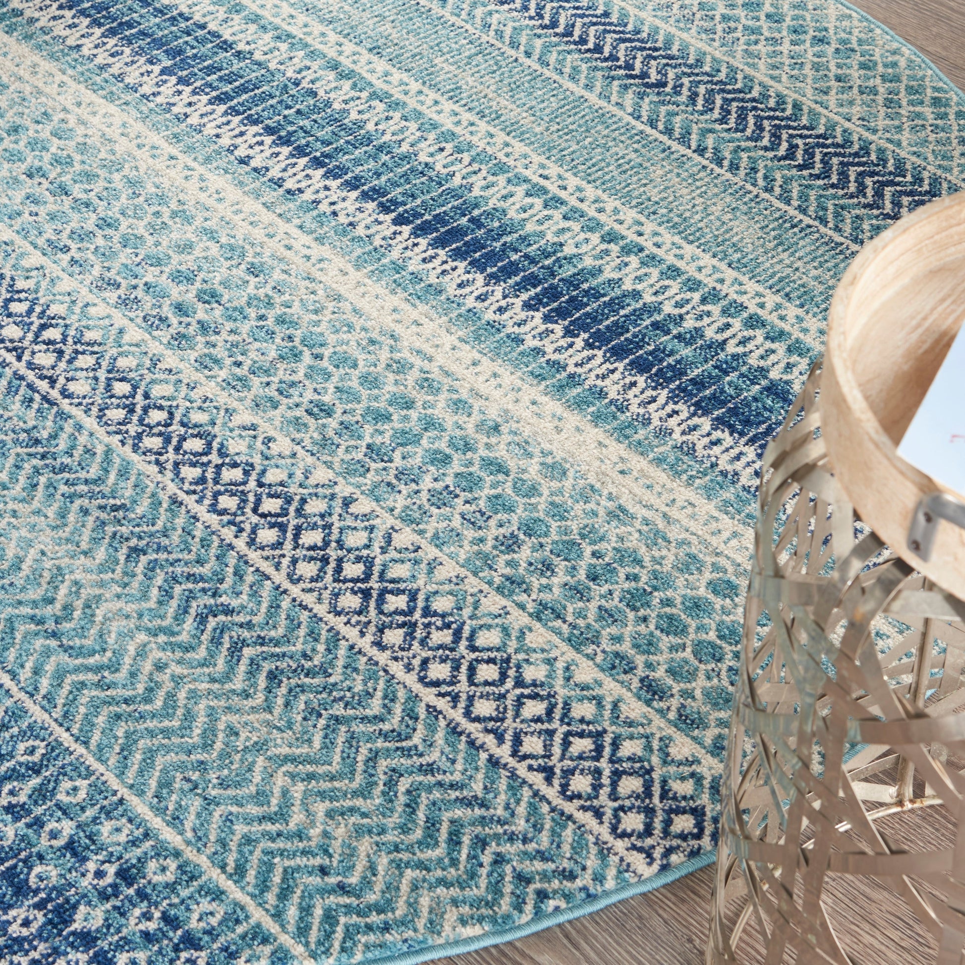 - Motifs géométriques côtiers avec des motifs de tapis berbères et des couleurs bleu indigo