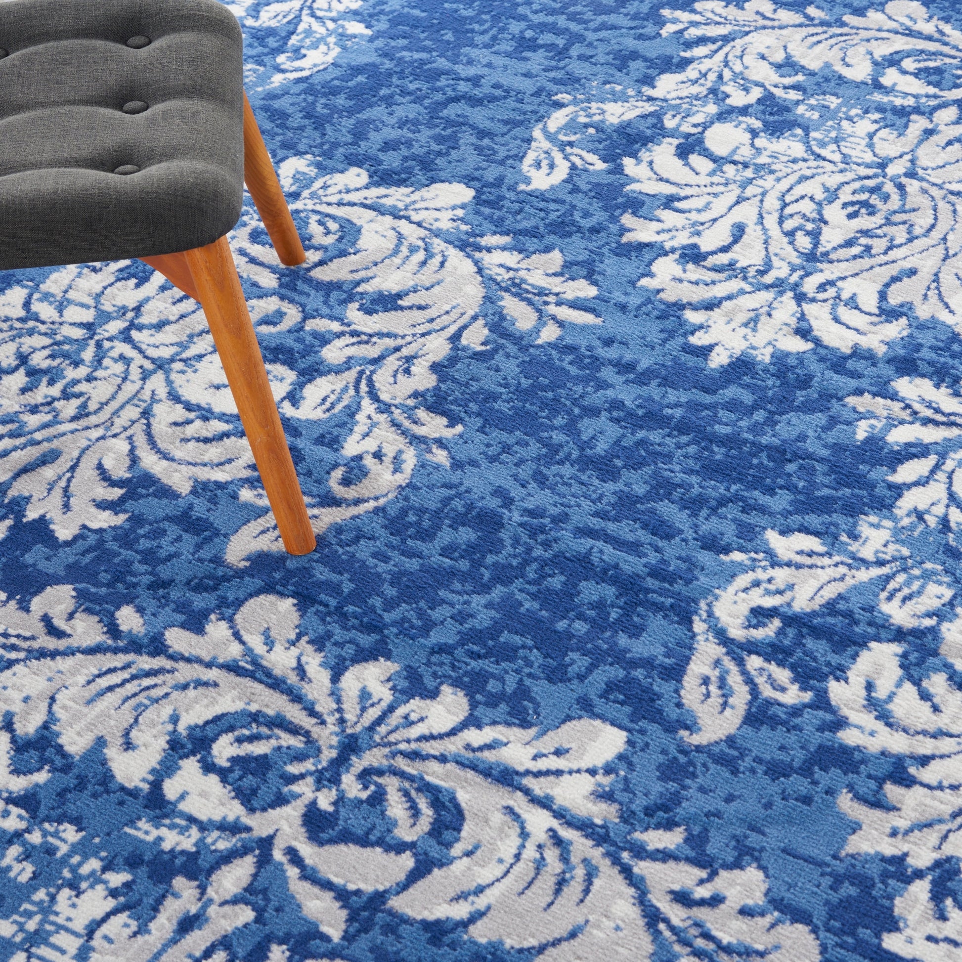 Le motif damassé surdimensionné de ce tapis de la collection Whimsicle crée un effet saisissant dans votre décor de style ferme, cottage ou campagne française. Les guirlandes florales bleu marine sur un fond gris et ivoire sont légèrement patinées pour une ambiance vintage dans n'importe quelle pièce. Ce tapis doux et fin est fabriqué à la machine à partir de fibres de polyester faciles à nettoyer.