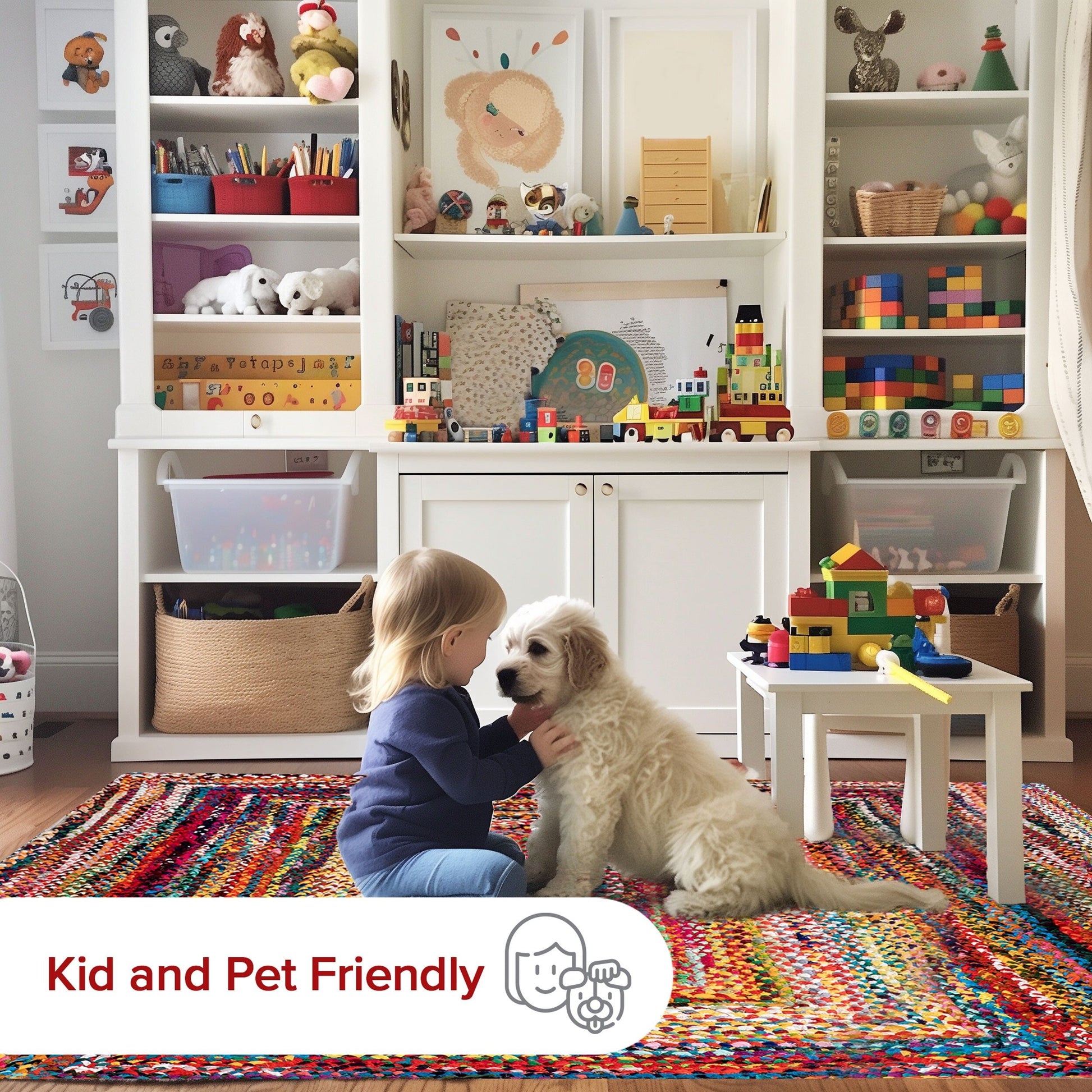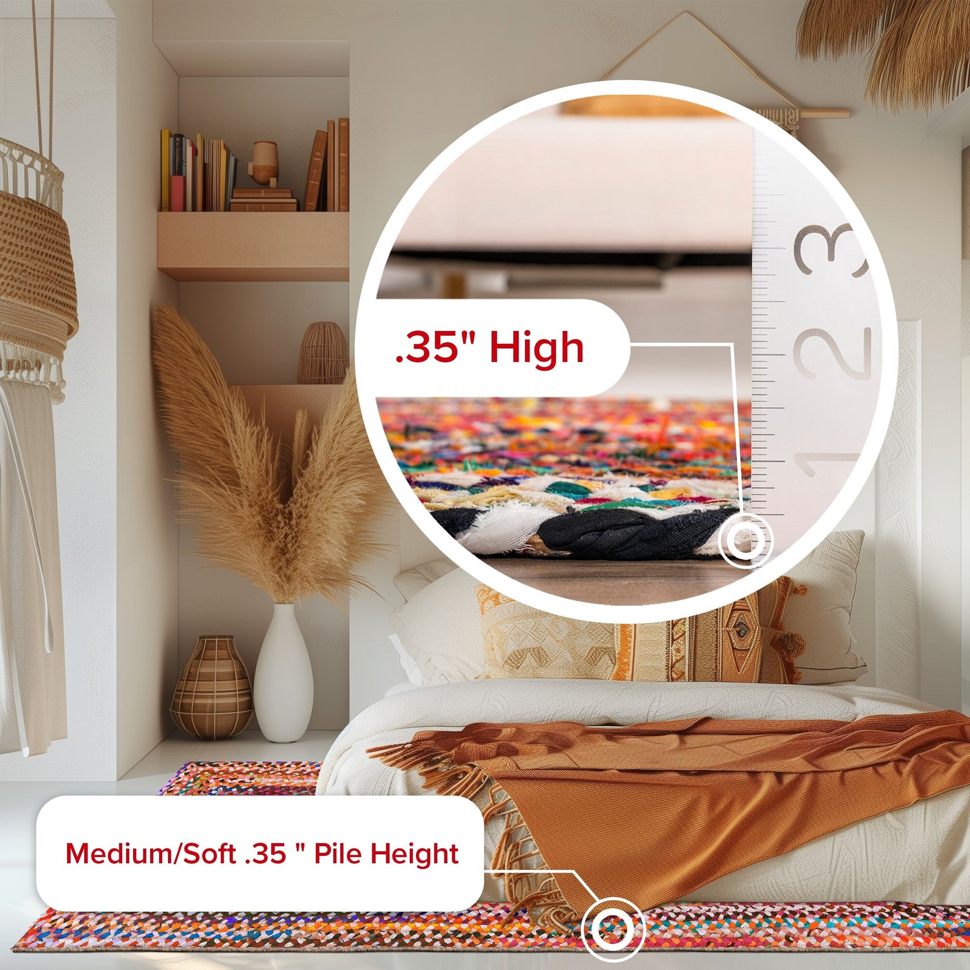 Illuminez votre pièce avec ce tapis bohème aux couleurs éclatantes. Tressé à la main en Inde à partir de coton recyclé, chaque tapis est unique, avec des variations de couleur et de motif propres à l'artisan qui l'a confectionné. Ce revêtement de sol est idéal pour apporter une touche de couleur à n'importe quel espace de votre maison. Créez l'intérieur de vos rêves avec nos tapis faciles d'entretien et adaptés aux animaux de compagnie.