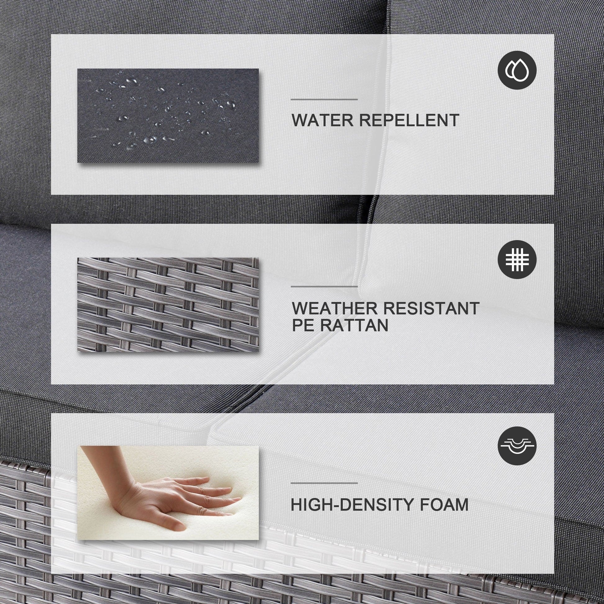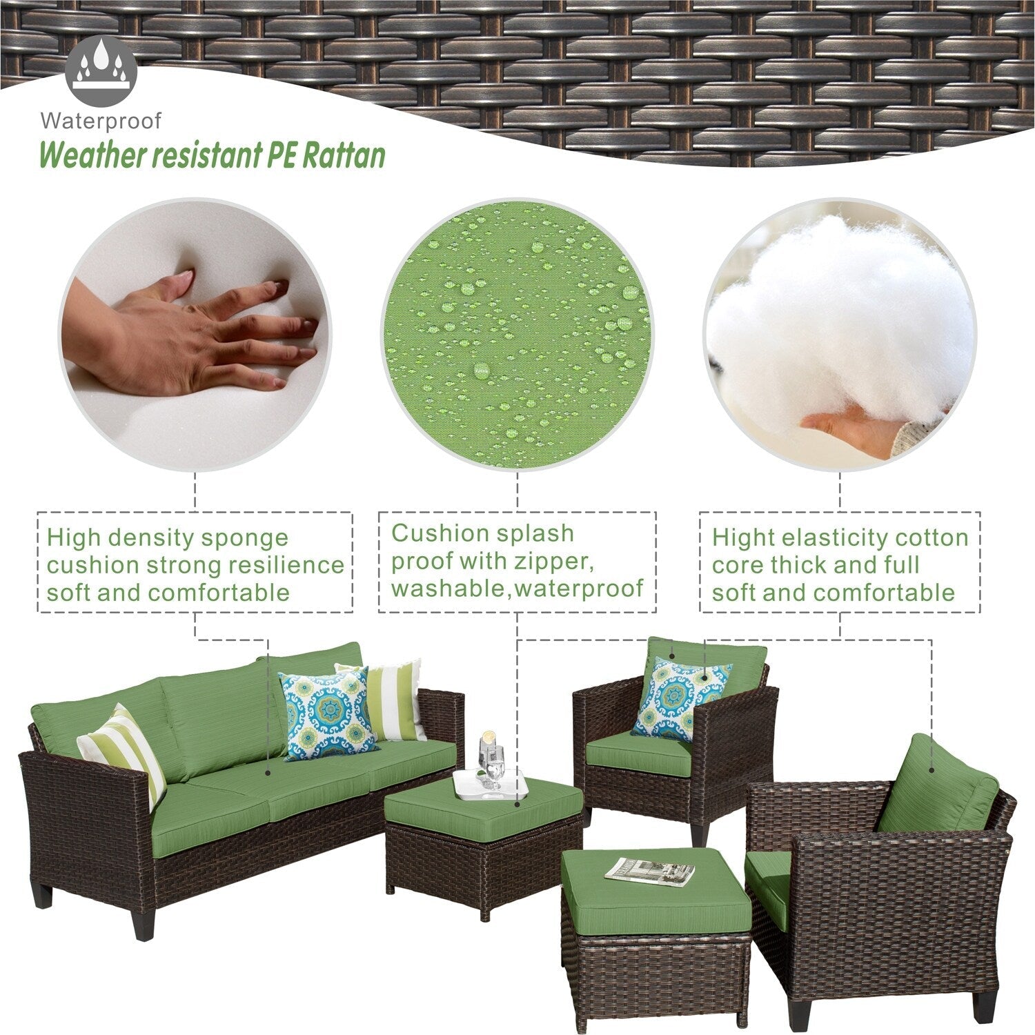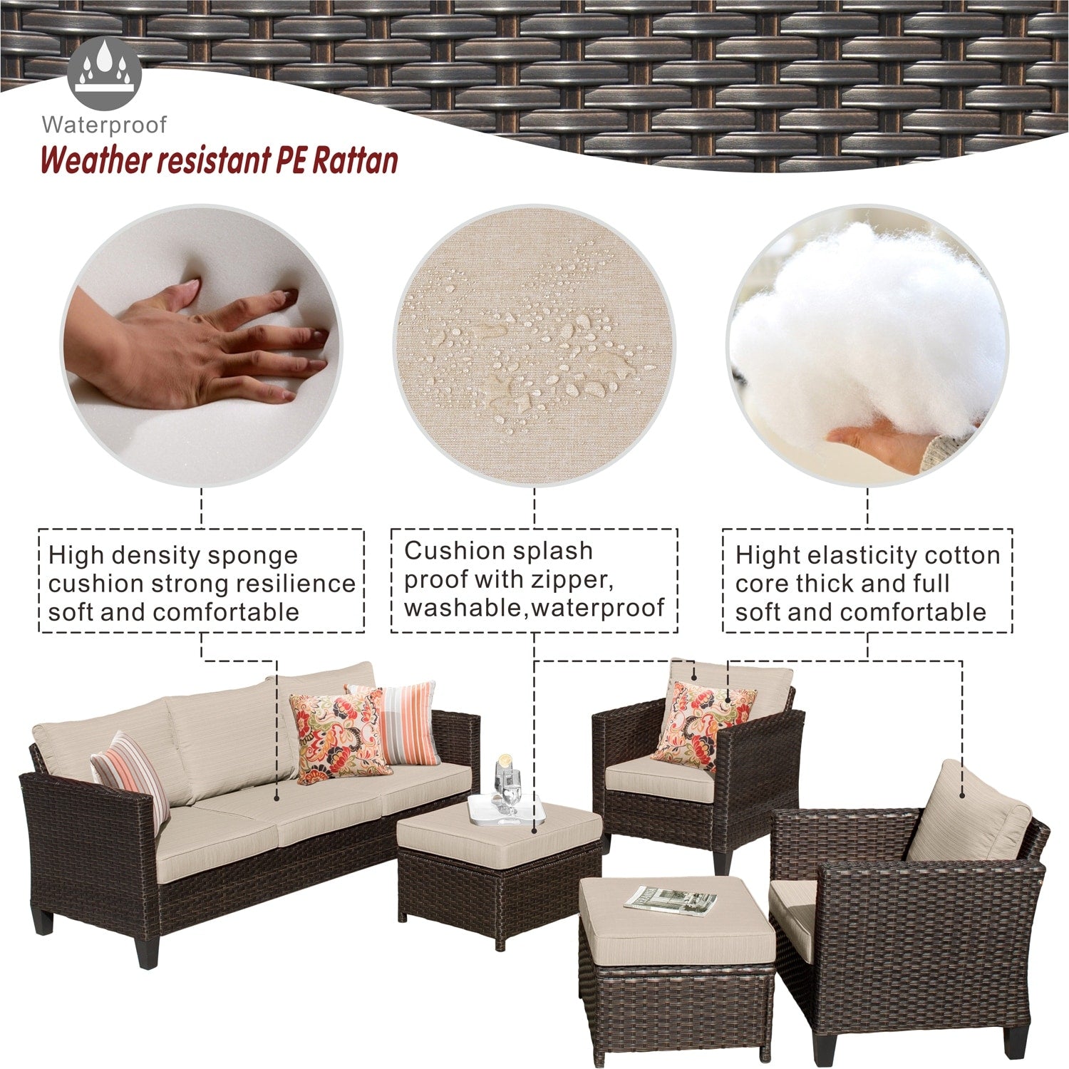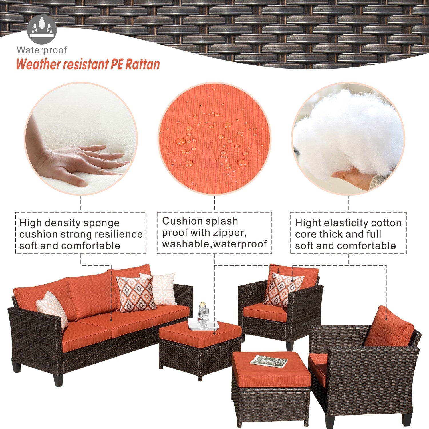 - Résistant à l'eau et aux intempéries : Les coussins et le mobilier sont conçus pour résister à l'eau, ce qui les rend parfaits pour résister à une pluie légère ou à la neige. Bien que cet ensemble résiste facilement à la plupart des conditions météorologiques, il est préférable de le protéger des intempéries extrêmes pour une meilleure longévité.