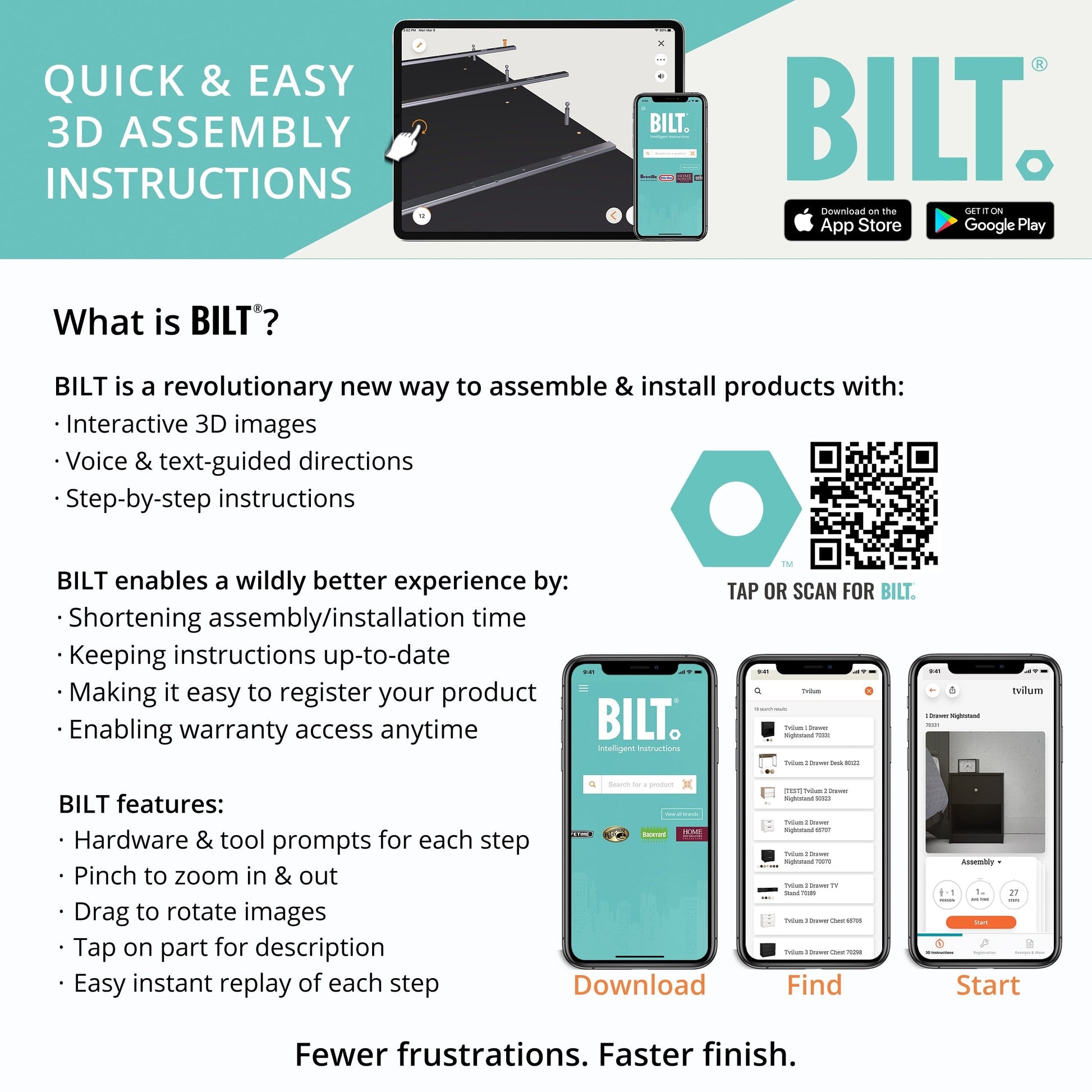- Assemblage interactif 3D avec BILT : les instructions pour ce produit sont disponibles via l'application gratuite BILT. Découvrez une méthode révolutionnaire d'assemblage et d'installation de produits avec voix, texte et images animées interactives.