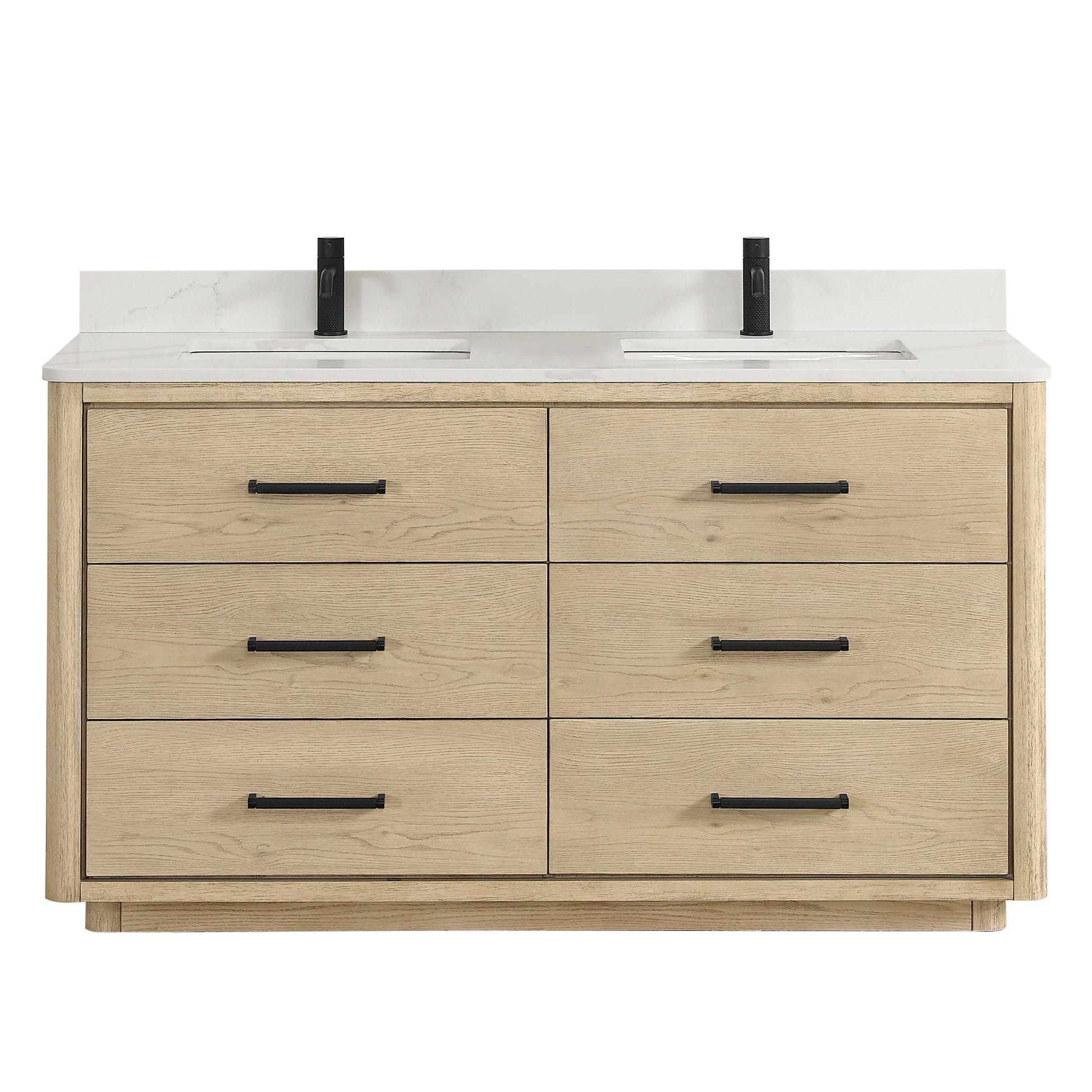 Transformez votre salle de bains en un havre de style et de sophistication grâce à notre meuble-lavabo autoportant de la série Porto, un meuble alliant savoir-faire artisanal et praticité au quotidien. Ce meuble raffiné allie la chaleur et l'élégance texturées du chêne massif au quartz blanc immaculé, créant un style à la fois accueillant et captivant. Ses profonds tiroirs à queue d'aronde avec compartiments vous permettent de ranger vos essentiels de manière discrète et organisée.