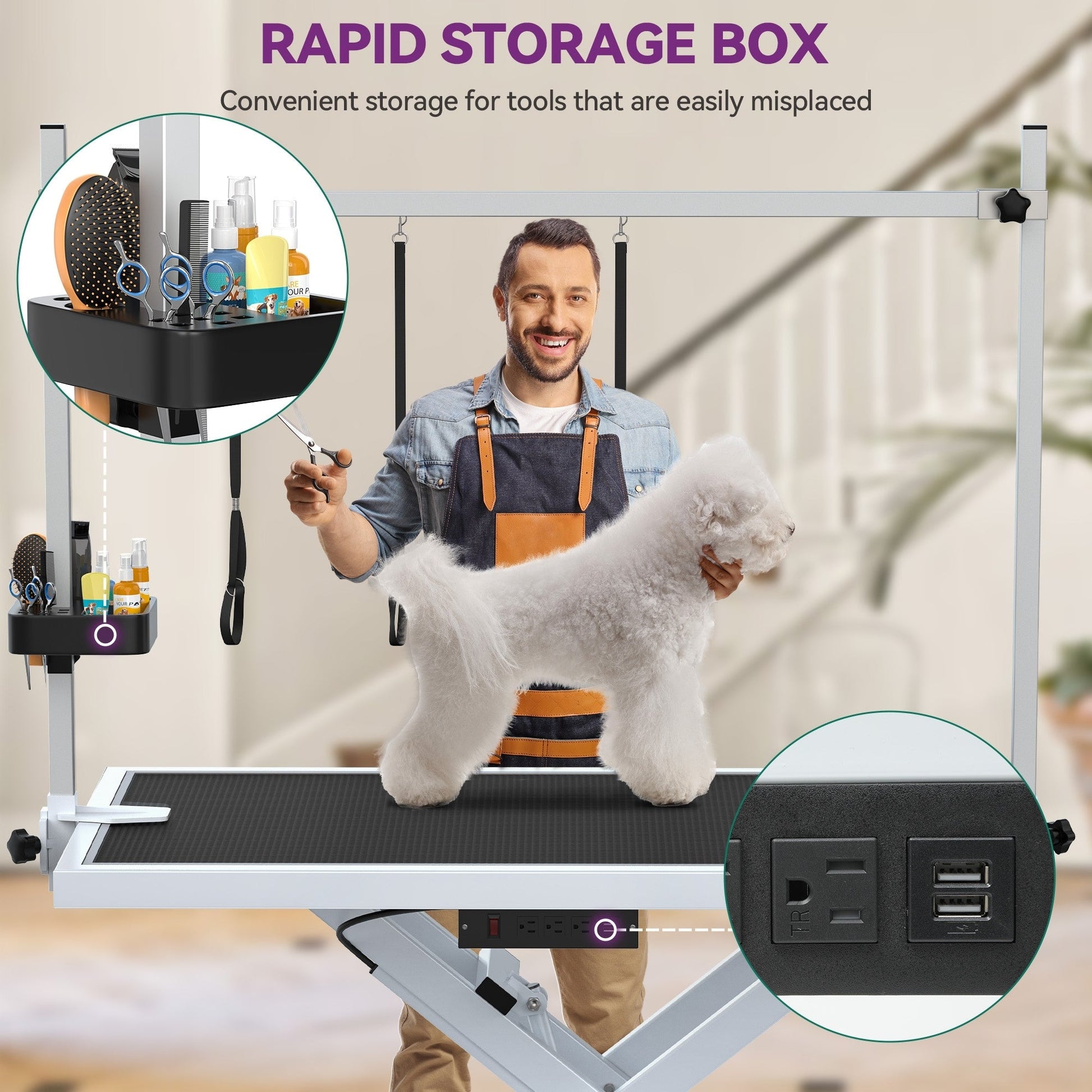 Le plateau en silicone antidérapant et imperméable de qualité supérieure offre un toucher doux et délicat aux pattes de votre animal et garantit un nettoyage des poils sans tracas. À utiliser avec un nœud coulant et un anneau de retenue pour maintenir l'animal en position pendant un toilettage prolongé et éviter les blessures. Toilettez votre animal à tout moment grâce à cette table de toilettage électrique robuste. Convient à tous les animaux de petite, moyenne et grande taille, comme les caniches, les schnauzers, les golden retrievers, les samoyèdes, les chats, etc., pour le toilettage, le brossage, la coupe et l'habillage.