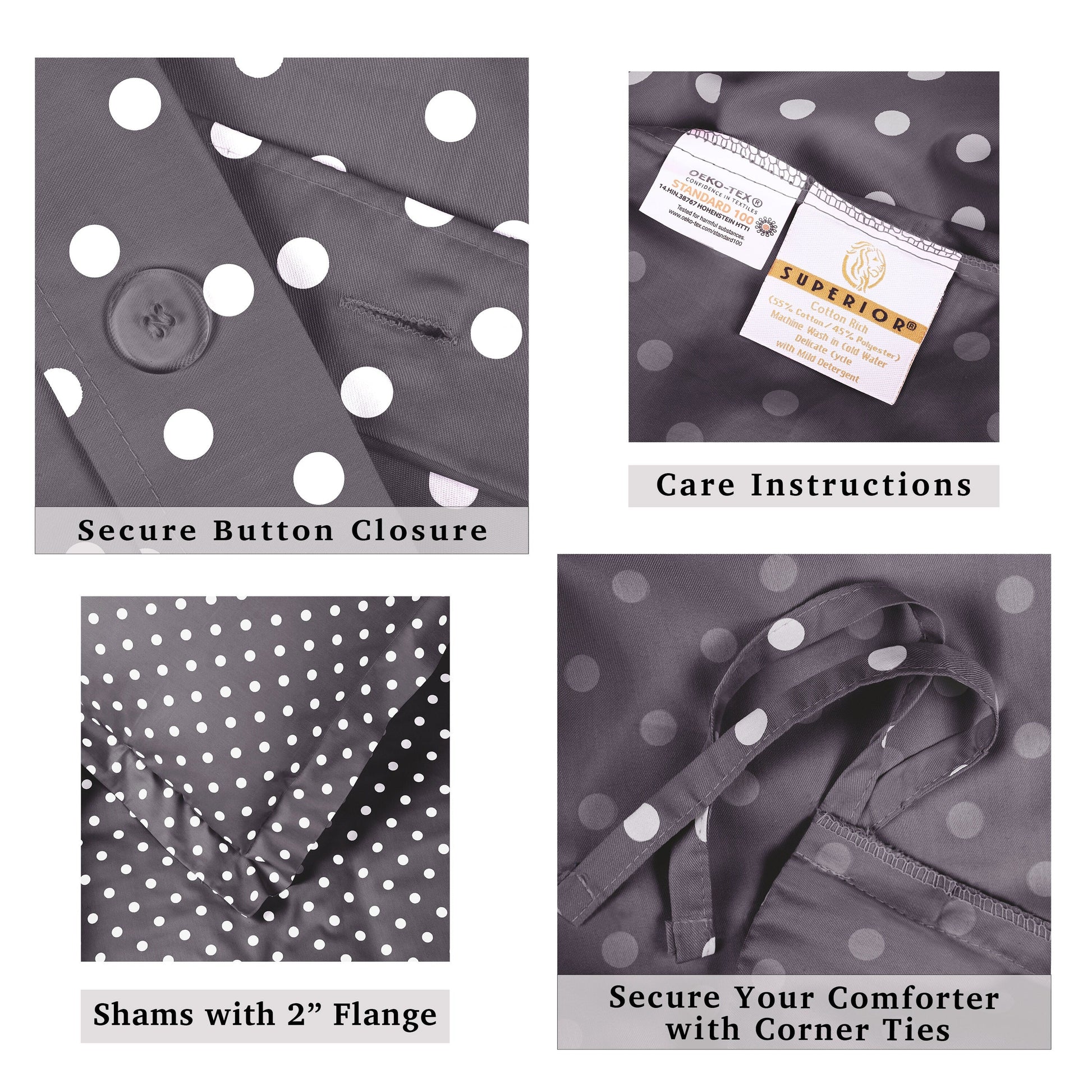 Ajoutez une touche de couleur à votre chambre avec la parure de lit Miranda Haus Polka Dot 600 fils/cm². Fabriquée dans un mélange coton-polyester de qualité supérieure, cette parure offre douceur et confort, pour une sensation de confort luxueux. La housse de couette est dotée de boutons transparents dissimulés qui la maintiennent bien en place. L'ensemble est accompagné de taies d'oreiller assorties (deux pour les tailles Double/Queen et King) avec un charmant rebord de 5 cm pour une touche de sophistication. Chez Superior, nous accordons une grande importance aux besoins de nos clients et garantissons l'intégrité de nos produits. Nous sommes convaincus qu'aucun détail n'est trop petit pour garantir une expérience client exceptionnelle.