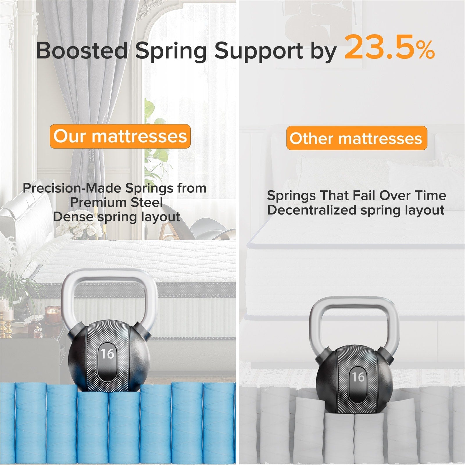 - Ressorts hélicoïdaux 23,5 % plus épais que la norme du marché : Offrent un meilleur soutien, une durée de vie plus longue et empêchent l'effondrement.