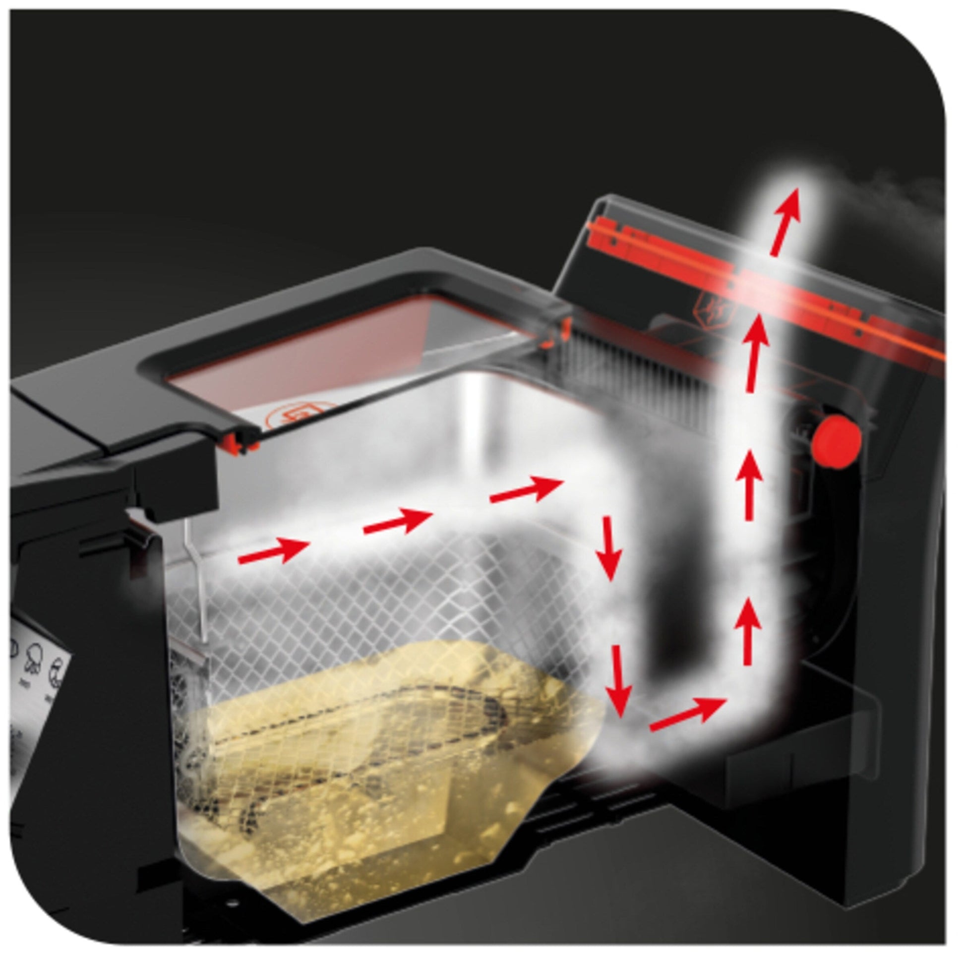 La friteuse sans odeur T-Fal vous permet de savourer vos fritures préférées tout en réduisant les odeurs de 74 % grâce à son système de filtration actif unique. Elle frit parfaitement tous types de viandes, poissons, légumes et tout ce que vous souhaitez frire ! Le contrôle de température variable et la minuterie réglable permettent de cuire les aliments à la température idéale pendant la durée idéale. Le système de filtration active de la friteuse sans odeur T-Fal réduit les odeurs et vous permet de savourer vos fritures préférées sans laisser de mauvaises odeurs dans toute la maison. Son système de sécurité assure une cuisson sans dégâts grâce à la montée et à la descente du panier couvercle fermé. Le couvercle est doté d'un système antibuée pour une visibilité optimale des aliments pendant la cuisson. Sa compacité lui confère un design élégant qui s'intègre parfaitement à tout plan de travail.