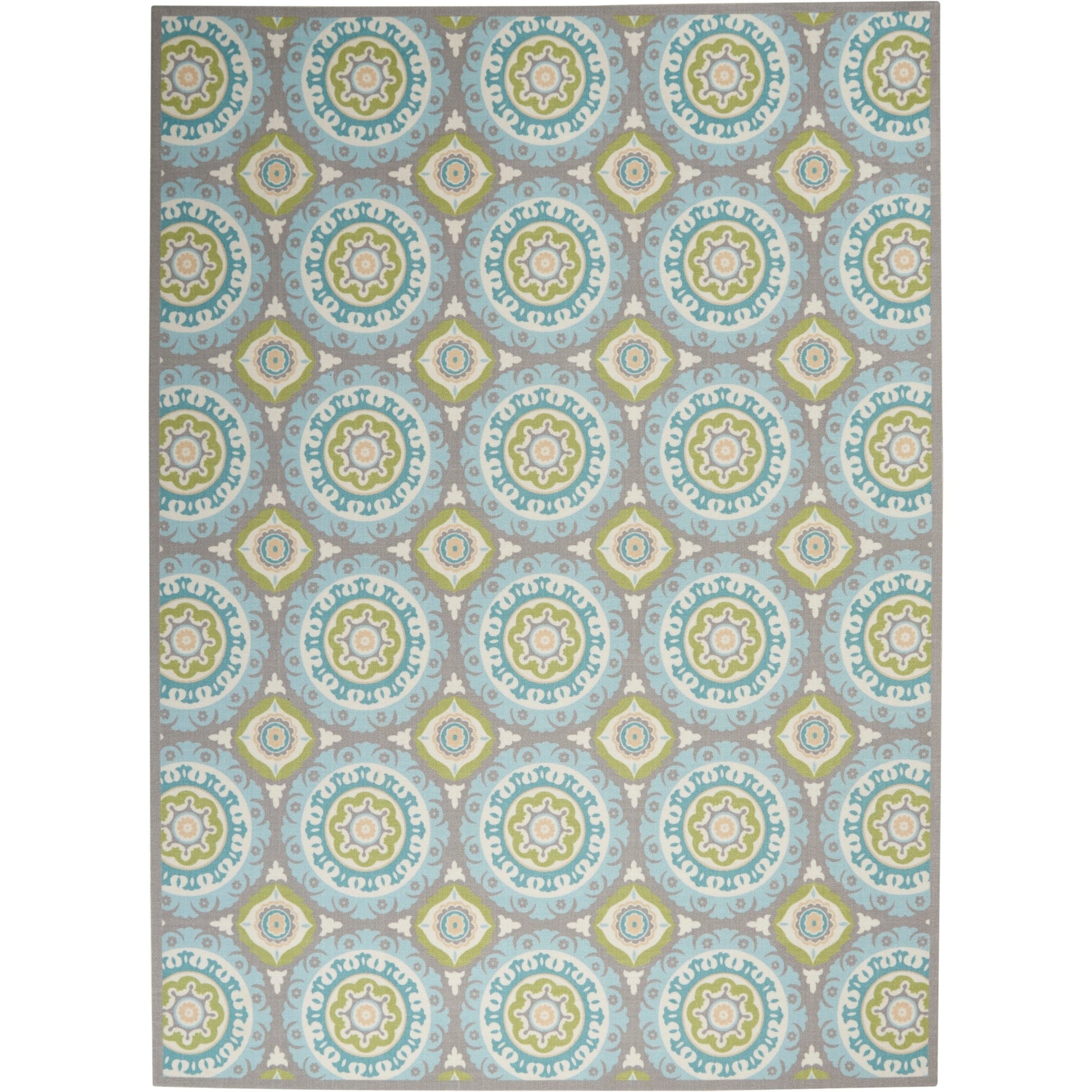 Apportez une touche cosmique à votre espace avec le tapis d'intérieur/extérieur Waverly Sun N' Shade Boho Medallion de Nourison. Son motif de médaillons entrelacés dans des tons turquoise, bleu et vert pâle crée un effet véritablement envoûtant. Fabriqué en polyester tissé à la machine avec une hauteur de velours de 1,25 cm, ce tapis au style contemporain et décontracté convient aussi bien à l'intérieur qu'à l'extérieur. Il contient également du latex et se lave facilement au jet d'eau.
